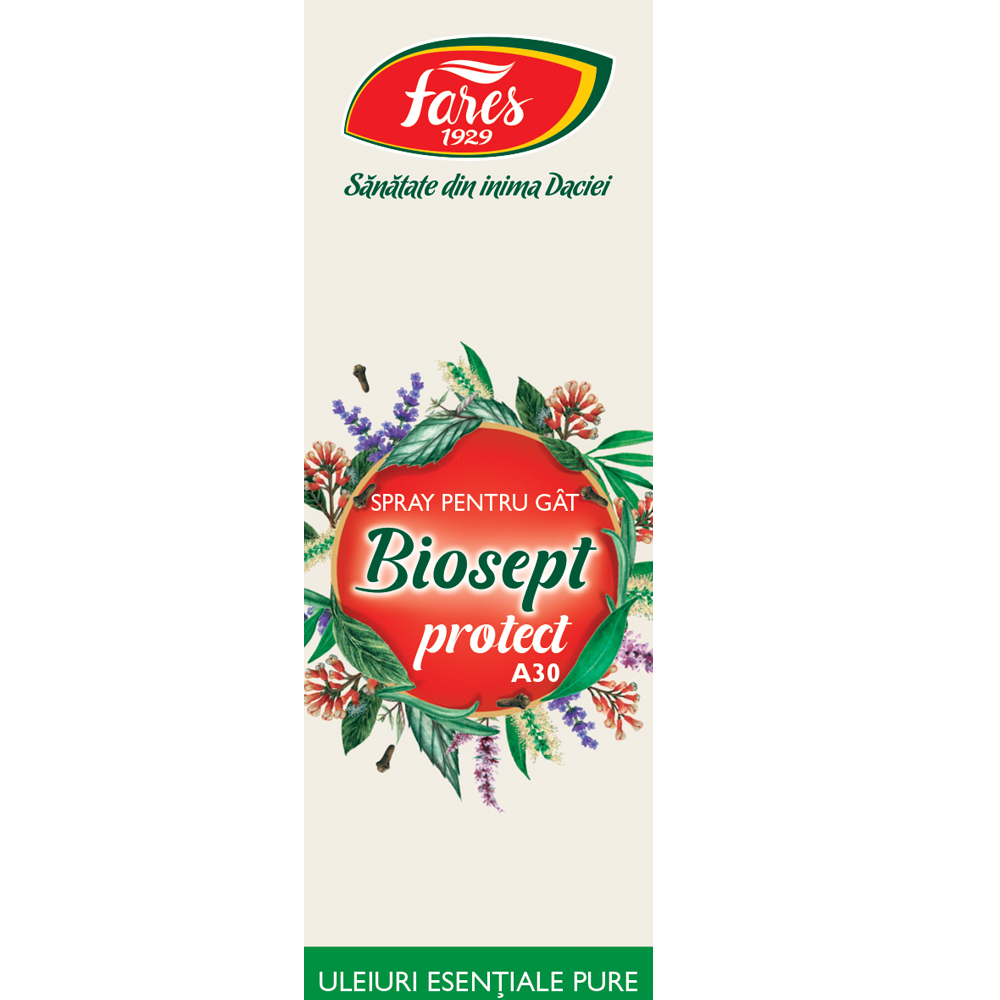 Suplimentul alimentar Biosept Protect Spray pentru gât de la Fares 1929 este un amestec de plante și uleiuri esențiale pure. Formula sa, care include frunze de măslin, mentă, tea tree și lavandă, este concepută pentru a susține confortul la nivelul gâtului.