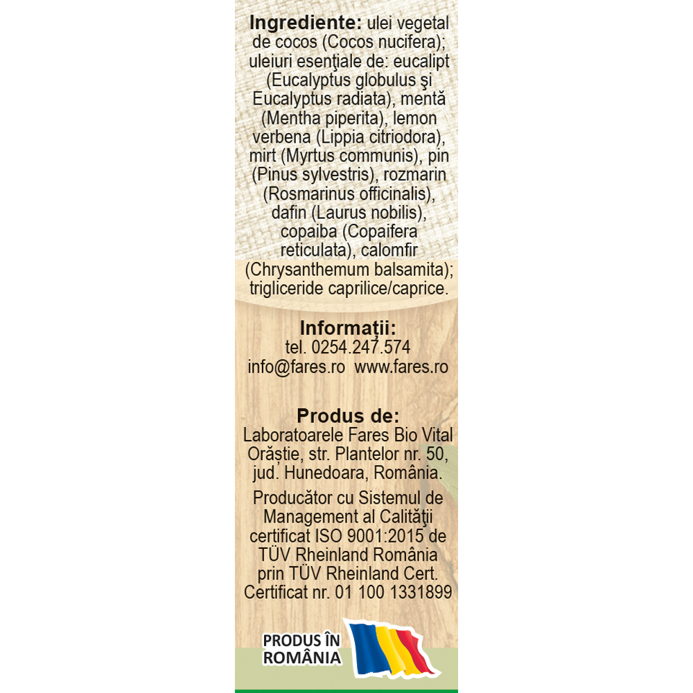 ulei vegetal de cocos (Cocos nucifera), uleiuri esențiale de: eucalipt (Eucalyptus globulus și Eucalyptus radiata), mentă (Mentha piperita), lemon verbena (Lippia citriodora), mirt (Myrtus communis), pin (Pinus sylvestris), rozmarin (Rosmarinus officinalis), dafin (Laurus nobilis), copaiba (Copaifera reticulata), calomfir (Chrysanthemum balsamita), trigliceride caprilice/caprice.