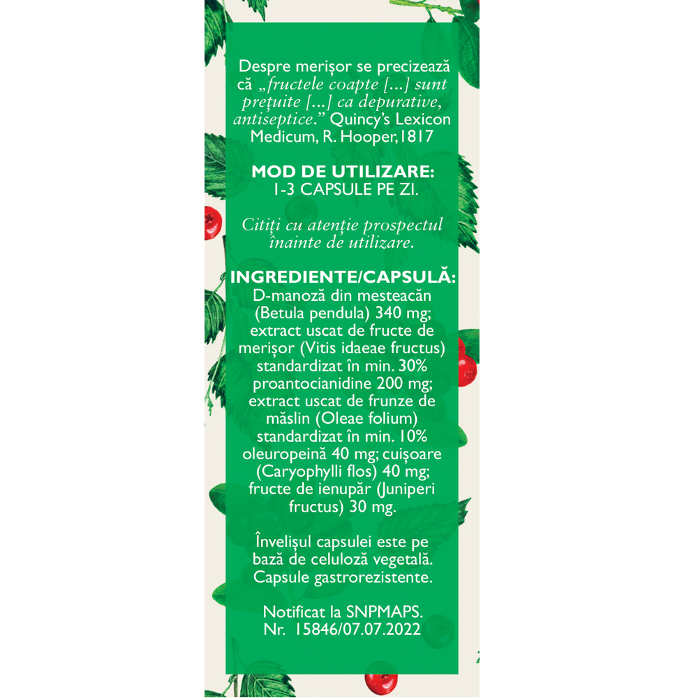 Poate impiedica aderarea bacteriilor la mucoasa vezicii și a căilor urinare prin D-MANOZĂ și merișor;