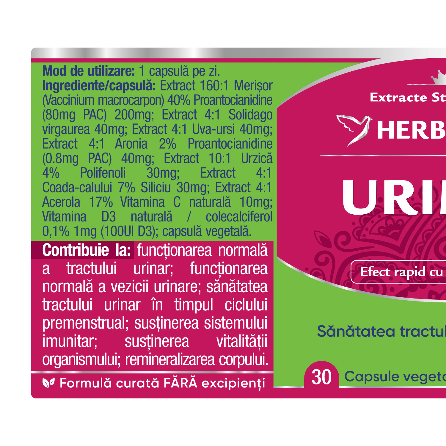 Ingrediente/capsulă: Extract 160:1 Merișor (Vaccinium macrocarpon) 40% Proantocianidine (80mg PAC) 200mg; Extract 4:1 Solidago virgaurea 40mg; Extract 4:1 Uva-ursi 40mg; Extract 4:1 Aronia 2% Proantocianidine (0.8mg PAC) 40mg; Extract 10:1 Urzică 4% Polifenoli 30mg; Extract 4:1 Coada-calului 7% Siliciu 30mg; Extract 4:1 Acerola 17% Vitamina C naturală 10mg; Vitamina D3 naturală / colecalciferol 0,1% 1mg (100UI D3); capsulă vegetală.