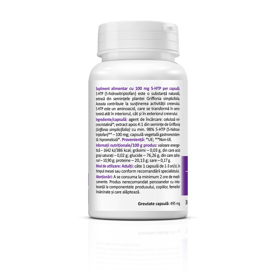 Supliment alimentar cu 100 mg 5-HTP per capsulă. 5-HTP (5-hidroxitriptofan) este o substanță naturală, extrasă din seminÈ›ele plantei Griffonia simplicifolia. Aceasta contribuie la susÈ›inerea activității creierului. 5-HTP este un aminoacid, care se transformă în serotonină atât în interiorul, cât È™i în exteriorul creierului.