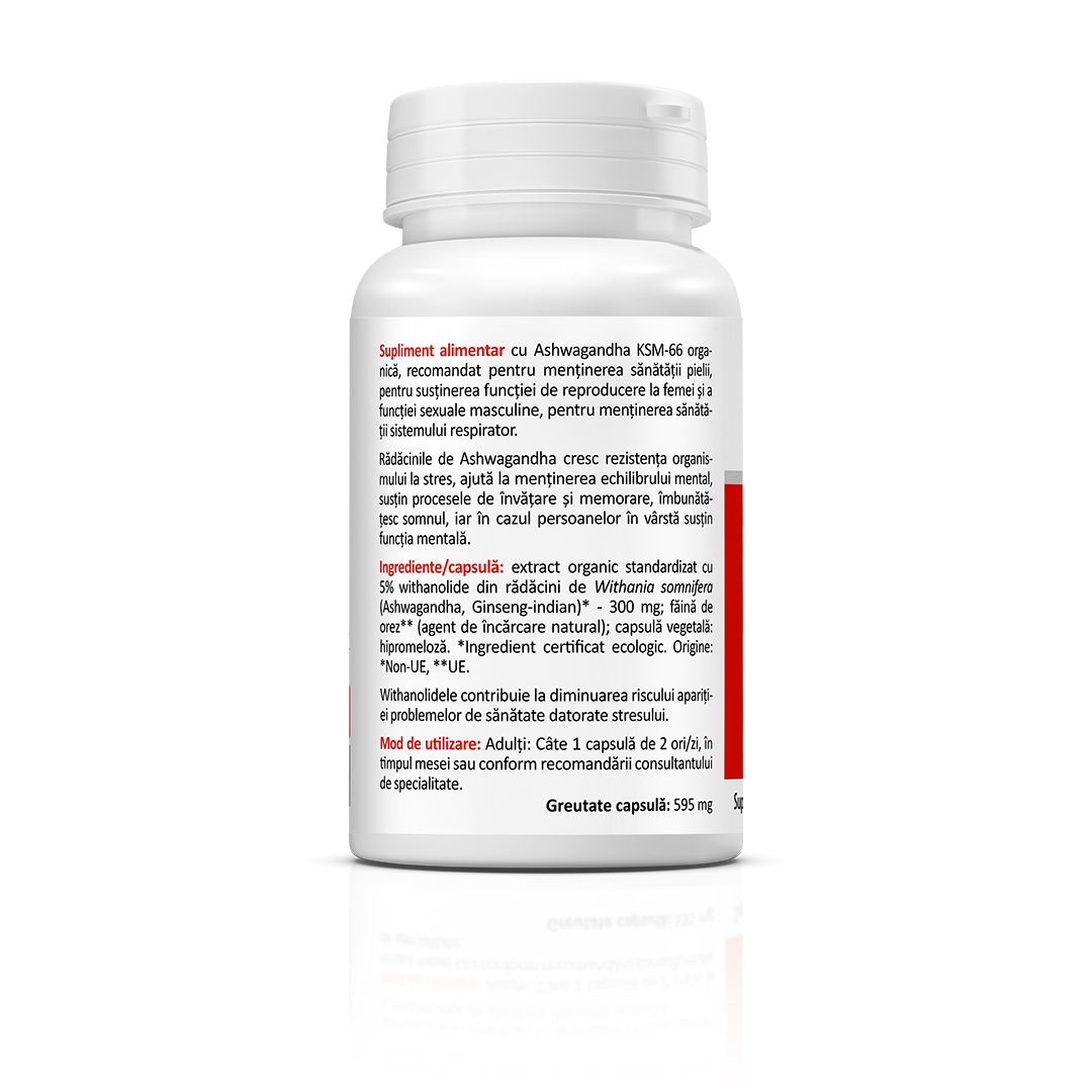 Supliment alimentar cu Ashwagandha KSM-66 organică, recomandat pentru menținerea sănătății pielii, pentru susținerea funcției de reproducere la femei și a funcției sexuale masculine, precum și pentru menținerea sănătății sistemului respirator. Rădăcinile de Ashwagandha contribuie la creșterea rezistenței organismului la stres, ajută la menținerea echilibrului mental, susțin procesele de învățare și memorare, contribuie la îmbunătățirea somnului și susțin funcția mentală la persoanele în vârstă.