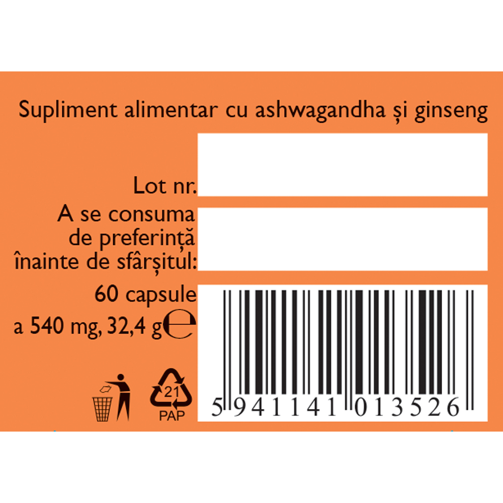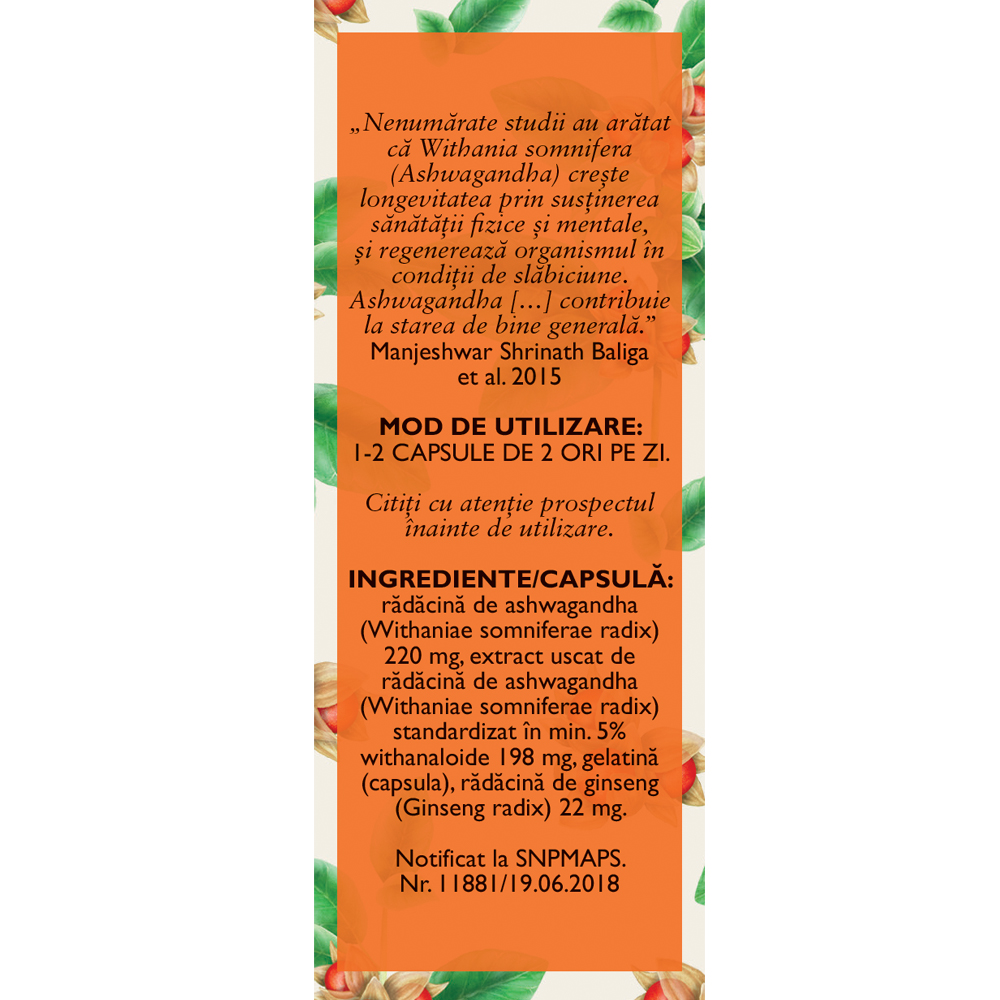 rădăcină de ashwagandha (Withaniae somniferae radix) 220 mg, extract uscat de rădăcină de ashwagandha (Withaniae somniferae radix) standardizat în min. 5% withanaloide 198 mg, gelatină (capsula), rădăcină de ginseng (Ginseng radix) 22 mg.