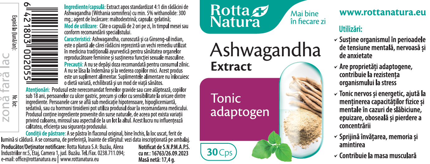 Ultima actualizare a informatiilor de prezentare pentru Ashwagandha extract, 30 capsule, Rotta Natura a fost efectuata la data de 23-04-2026.  |  Raporteaza Descriere Gresita