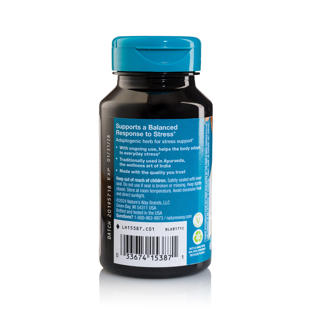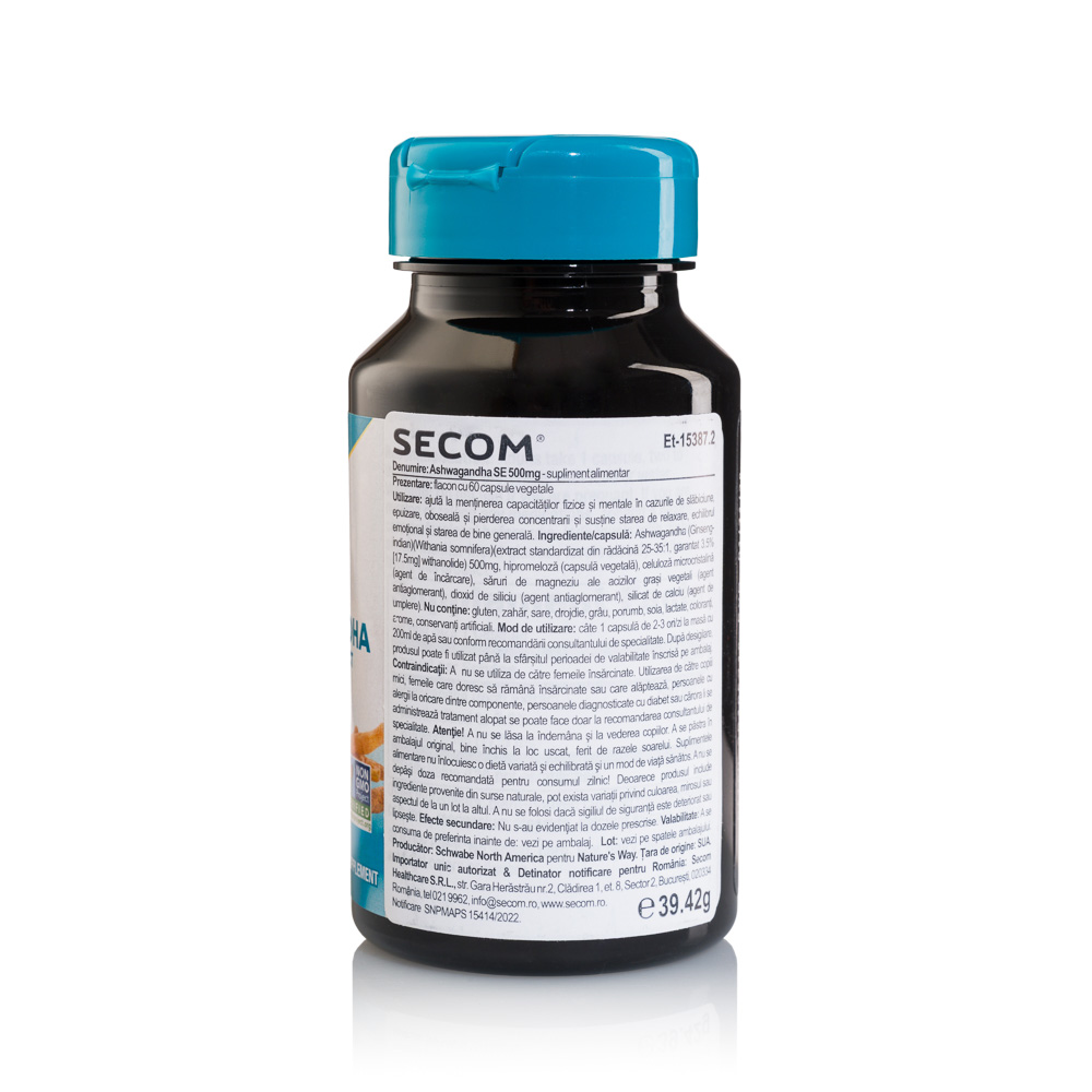 1 capsulă: Ashwagandha (Ginseng indian) (Withania somnifera) (extract standardizat din rădăcină 25–35:1, garantat 3,5% [17,5 mg] withanolide) 500 mg, hipromeloză (capsulă vegetală), celuloză microcristalină (agent de încărcare), săruri de magneziu ale acizilor grași vegetali (agent antiaglomerant), dioxid de siliciu (agent antiaglomerant), silicat de calciu (agent de umplere).