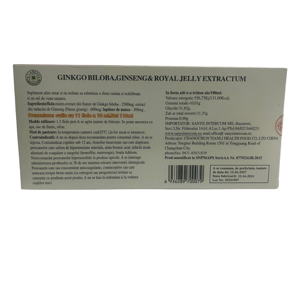 Ultima actualizare a informatiilor de prezentare pentru Ginkgo Biloba, Ginseng si Royal Jelly Extractum, 11 fiole x 10 ml, Tianran a fost efectuata la data de 24-04-2026.
