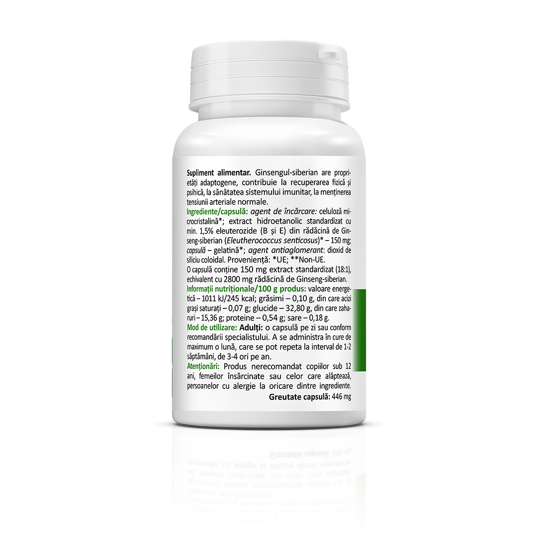 extract hidroetanolic din rădăcină de ginseng siberian (eleutherococcus senticosus) standardizat cu min. 1,5% eleuterozide (b și e) – 150 mg, celuloză microcristalină, dioxid de siliciu coloidal, capsulă (gelatină)