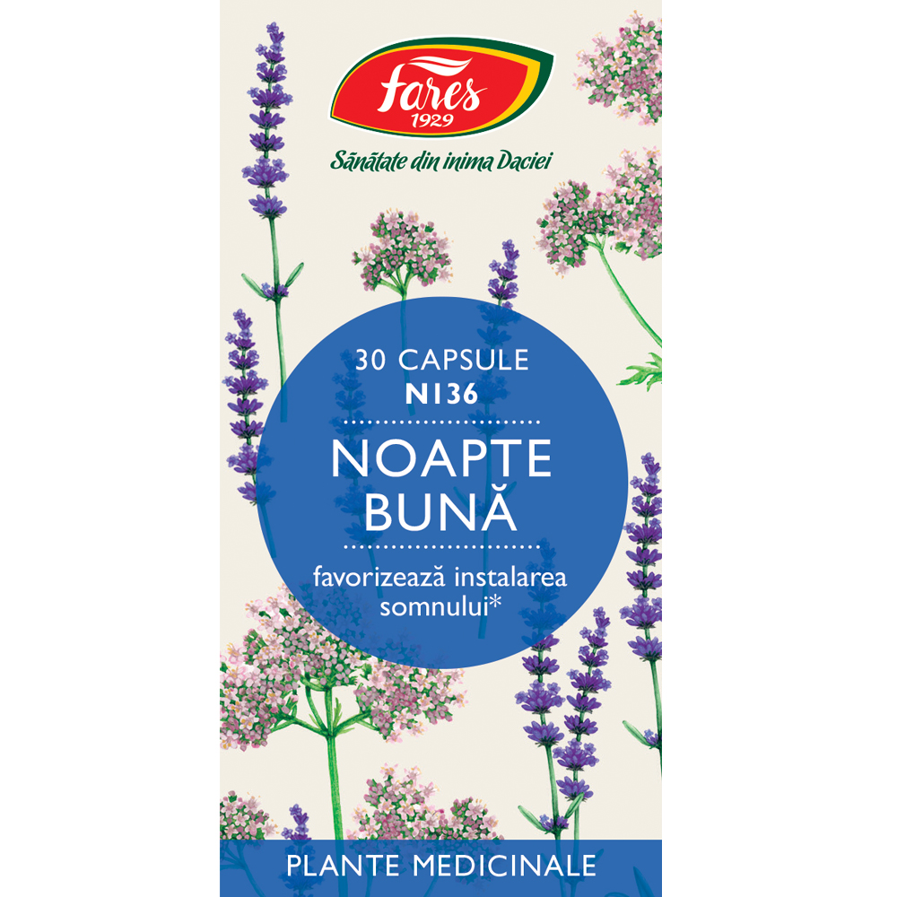 Suplimentul alimentar Noapte Bună de la Fares 1929 este un amestec de extracte și plante medicinale sub formă de capsule. Formula sa, ce include valeriană și lavandă, este concepută pentru a favoriza o stare de relaxare și pentru a contribui la un somn odihnitor.