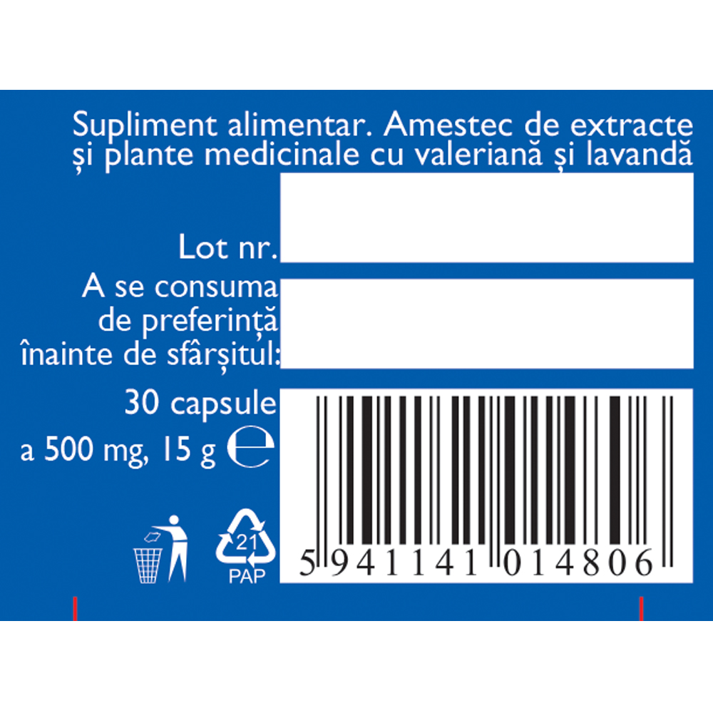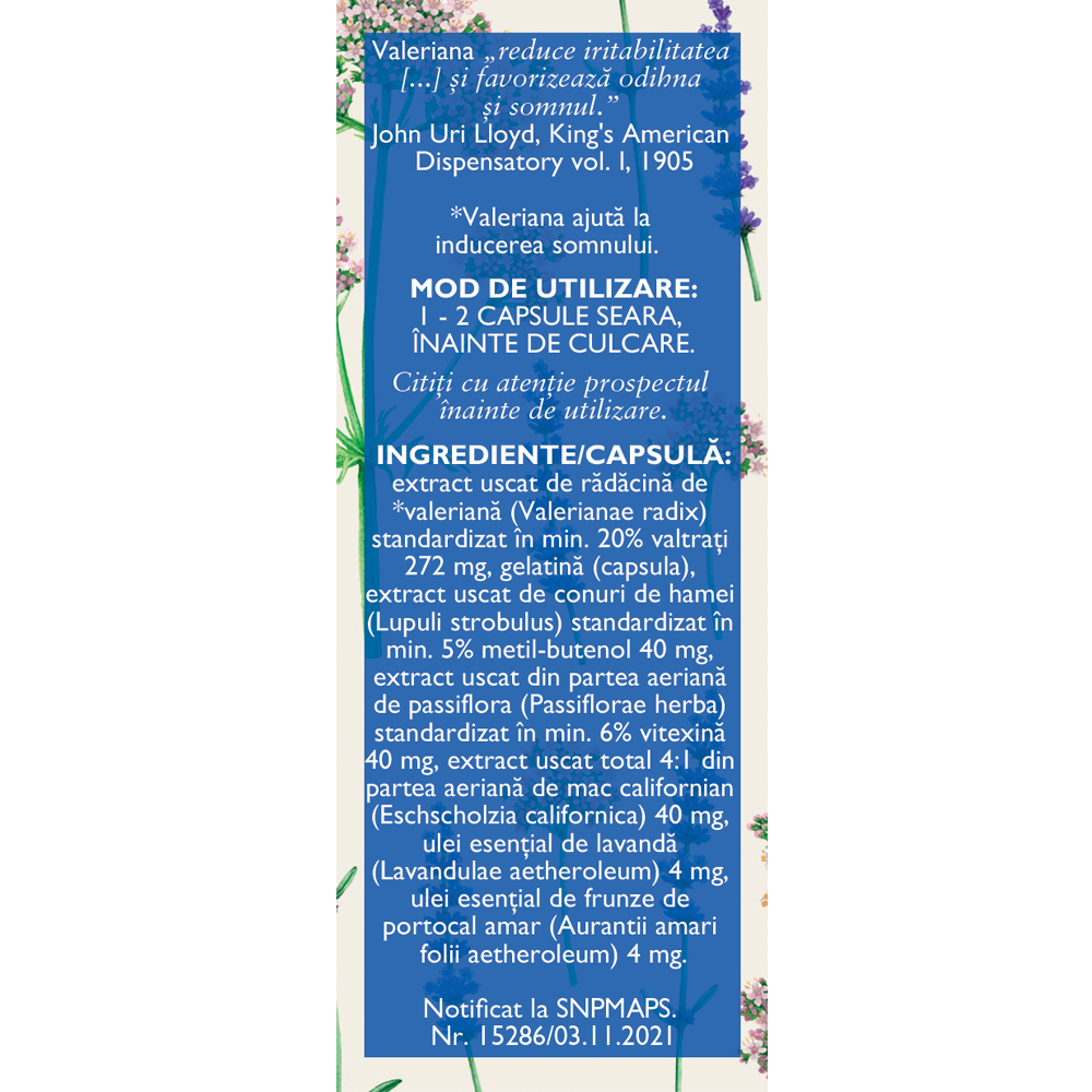 extract uscat de rădăcină de valeriană (Valerianae radix) standardizat în min. 20% valtrați 272 mg, gelatină (capsula), extract uscat de conuri de hamei (Lupuli strobuli) standardizat în min. 5% metil-butenol 40 mg, extract uscat din partea aeriană de passiflora (Passiflorae herba) standardizat în min. 6% vitexină 40 mg, extract uscat total 4:1 din partea aeriană de mac californian (Eschscholzia california) 40 mg, ulei esențial de lavandă (Lavandulae aetheroleum) 4 mg, ulei esențial de frunze de portocal amar (Aurantii amari folii aetheroleum) 4 mg.