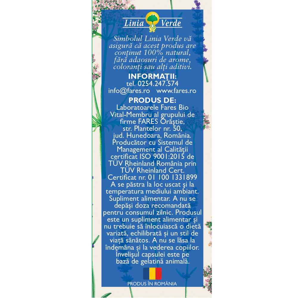 A nu se depăși doza recomandată pentru consumul zilnic. Produsul este un supliment alimentar și nu trebuie să înlocuiască o dietă variată, echilibrată și un stil de viață sănătos. A se păstra la loc uscat, la temperatura mediului ambiant și a nu se lăsa la îndemâna și la vederea copiilor mici.