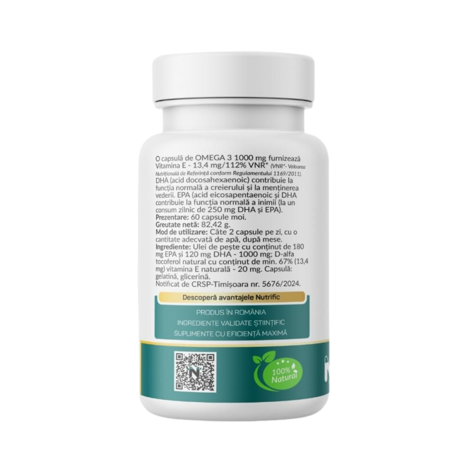 Pentru a observa efectele suplimentului Omega 3, este recomandată o administrare pe termen lung, de minimum 2-3 luni. Studiile arată că beneficiile cardiovasculare și antiinflamatorii devin vizibile după câteva luni de utilizare continuă. O capsulă de Omega 3 1000 mg furnizează Vitamina E – 13.4 mg/112% VNR (Valoarea Nutrițională de Referință conform Regulamentului 1169/2011).