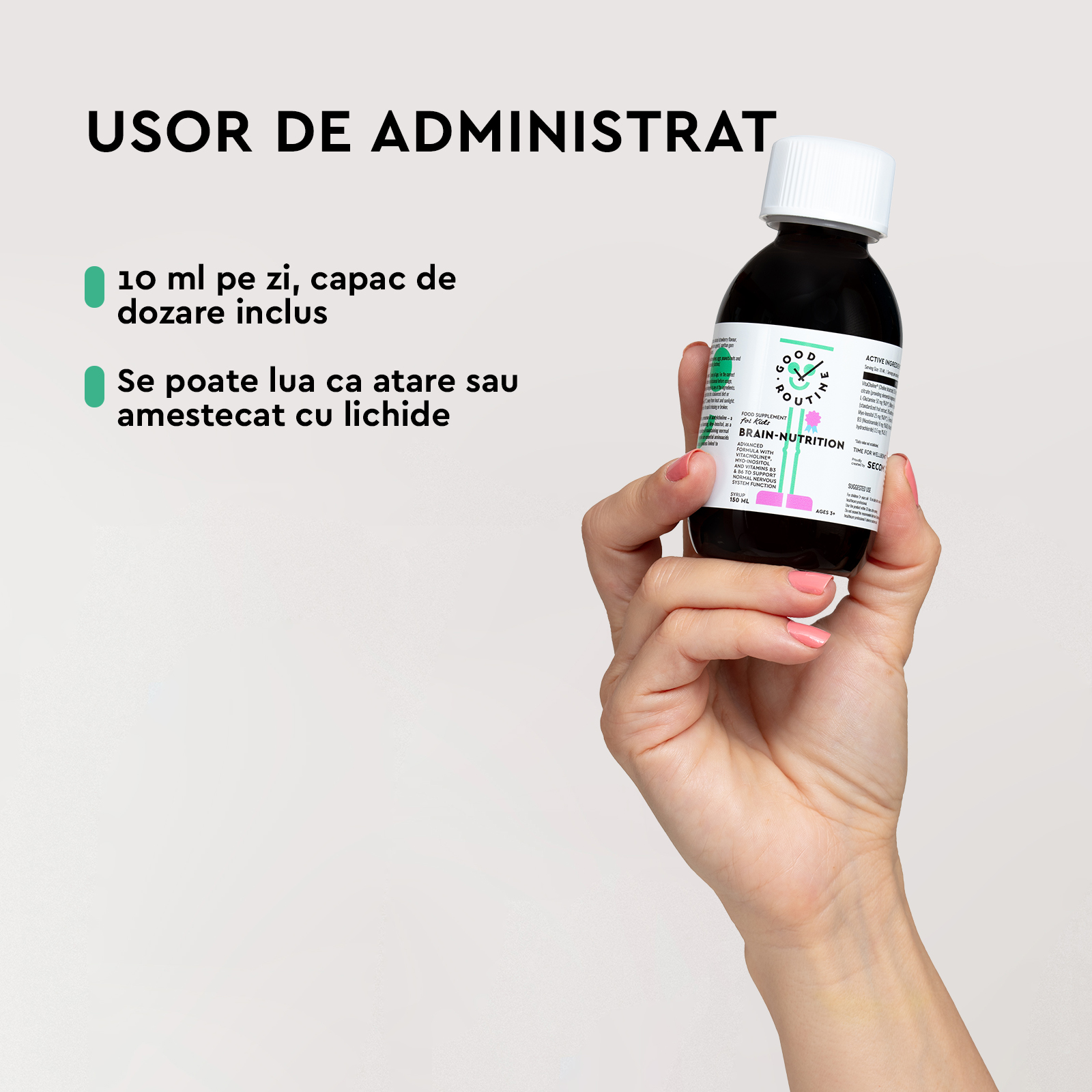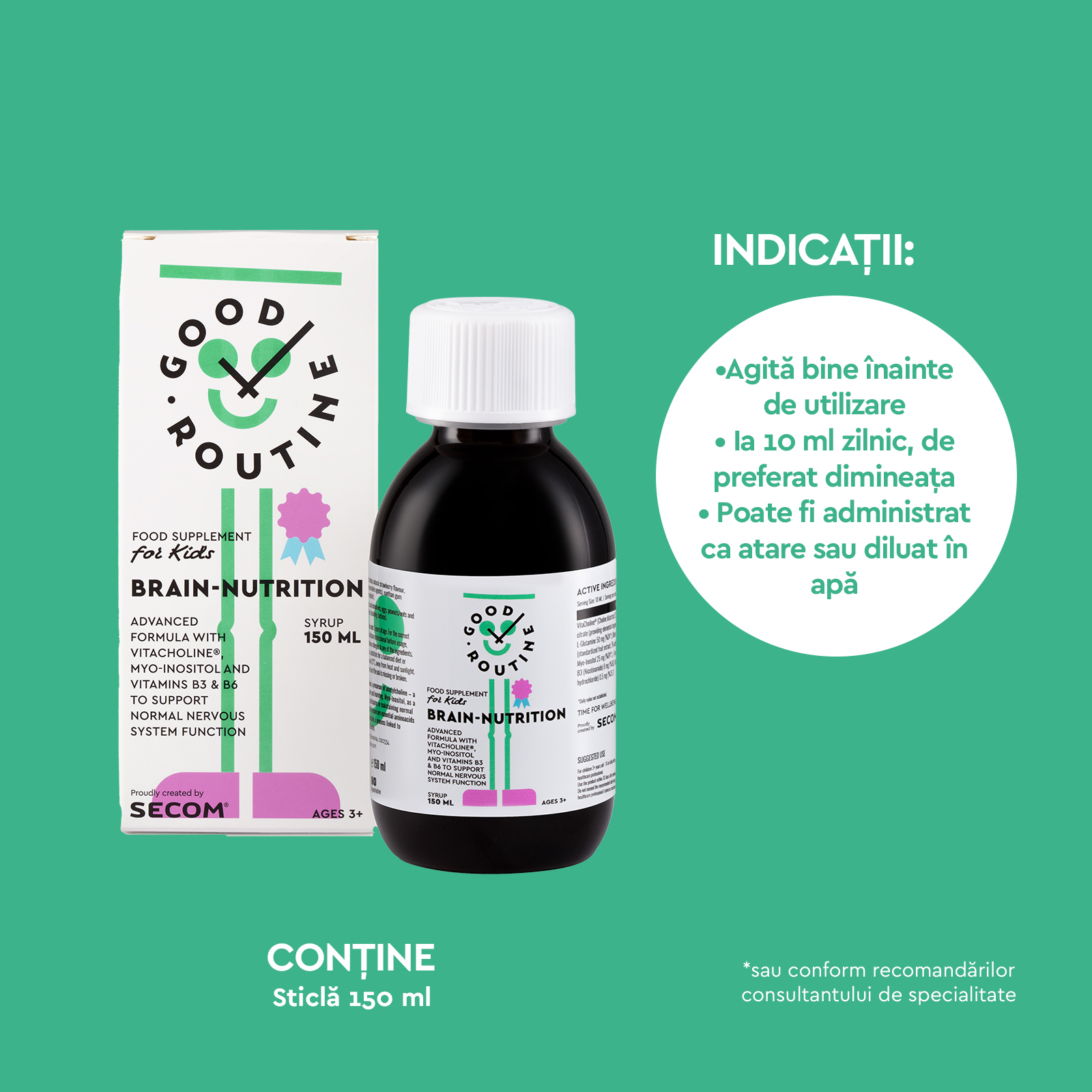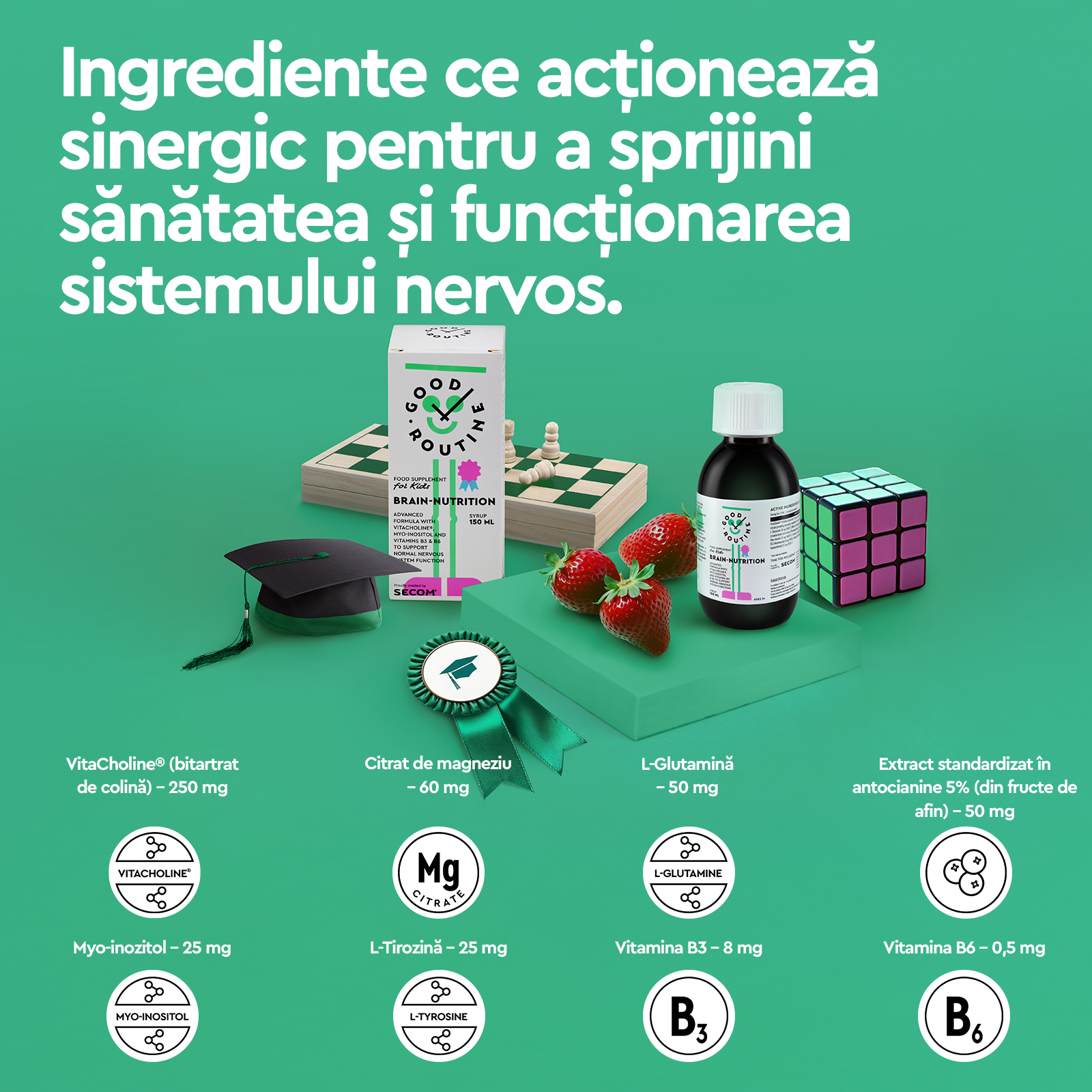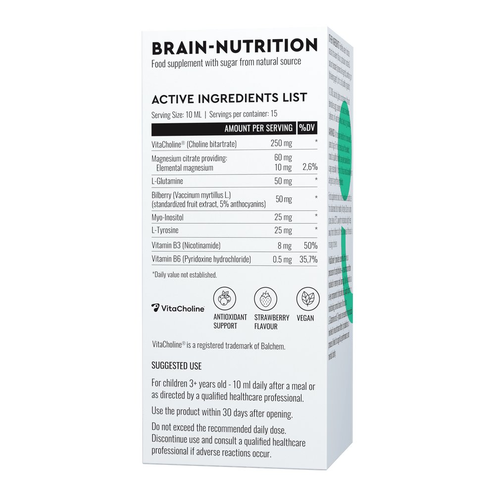 Brain-Nutrition este o formulă avansată ce asociază 8 neuronutrienți: VitaCholine®, mio-inozitol, magneziu, L-tirozină, L-glutamină, extract standardizat din Afin și vitaminele B3 și B6, care contribuie la funcționarea normală a sistemului nervos, la menținerea sănătății psihice, la reducerea oboselii și extenuării și la metabolismul normal al proteinelor și glicogenilor.