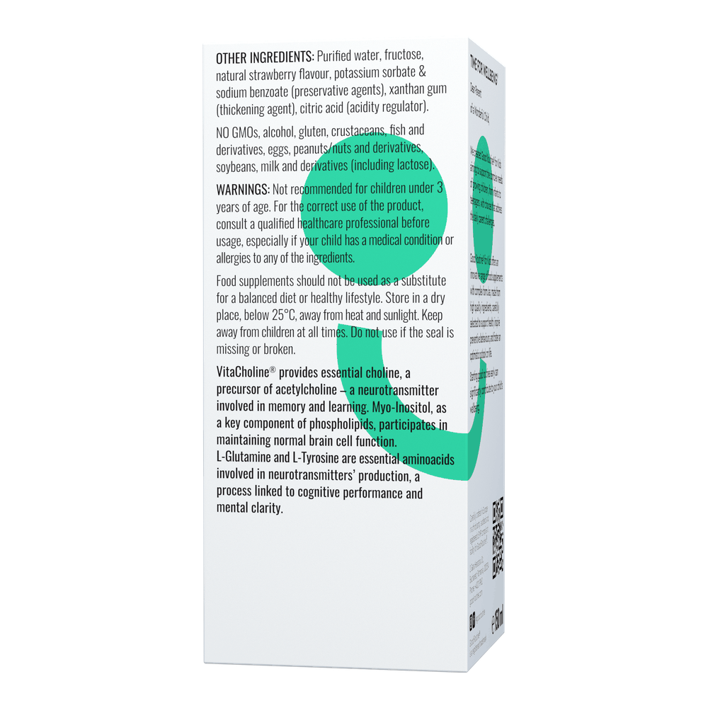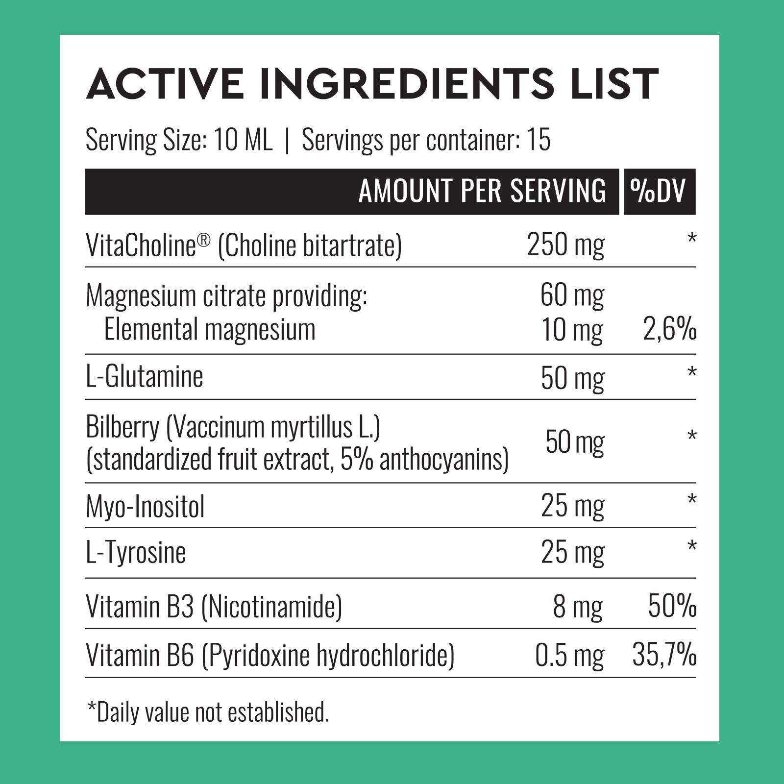 Ingrediente/10 ml: apă purificată; fructoză (îndulcitor); VitaCholine® (bitartrat de colină) 250 mg; citrat de magneziu (furnizând 10 mg magneziu elementar (2.6% VNR*)) 60 mg; L-glutamină 50 mg; Afin (Vaccinium myrtillus)(extract standardizat din fructe, furnizând 5% antocianine) 50 mg; aromă naturală de căpșuni; inozitol (mio-inozitol) 25 mg; L-tirozină 25 mg; sorbat de potasiu, benzoat de sodiu (conservanți); gumă xantan (agent de îngroșare); Vitamina B3 (nicotinamidă) 8 mg (50% VNR*); Vitamina B6 (clorhidrat de piridoxină) 0.5 mg (35.7% VNR*); acid citric (corector de aciditate).