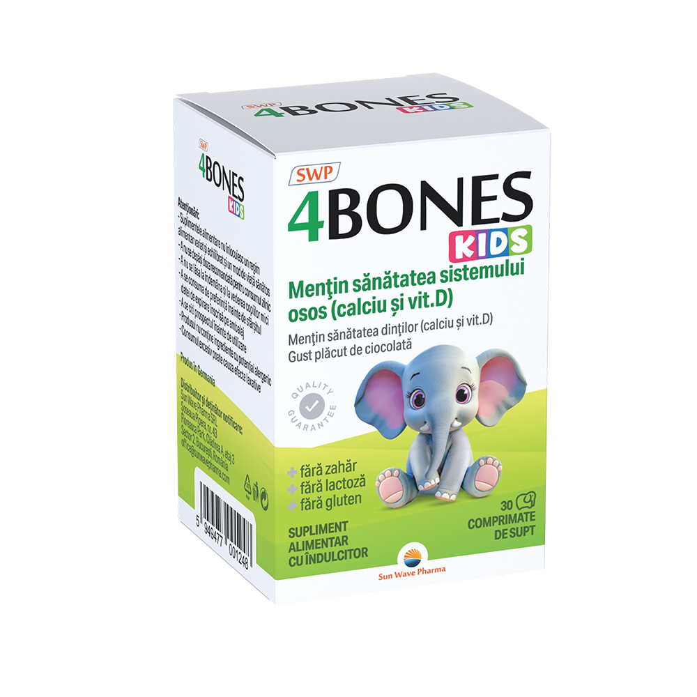Supliment alimentar pentru copii – 4 Bones Kids, cu calciu și vitamina D, contribuie la sustinerea sanatatii oaselor, dinților și a sistemului imunitar. Recomandat în etapele de creștere și dezvoltare.