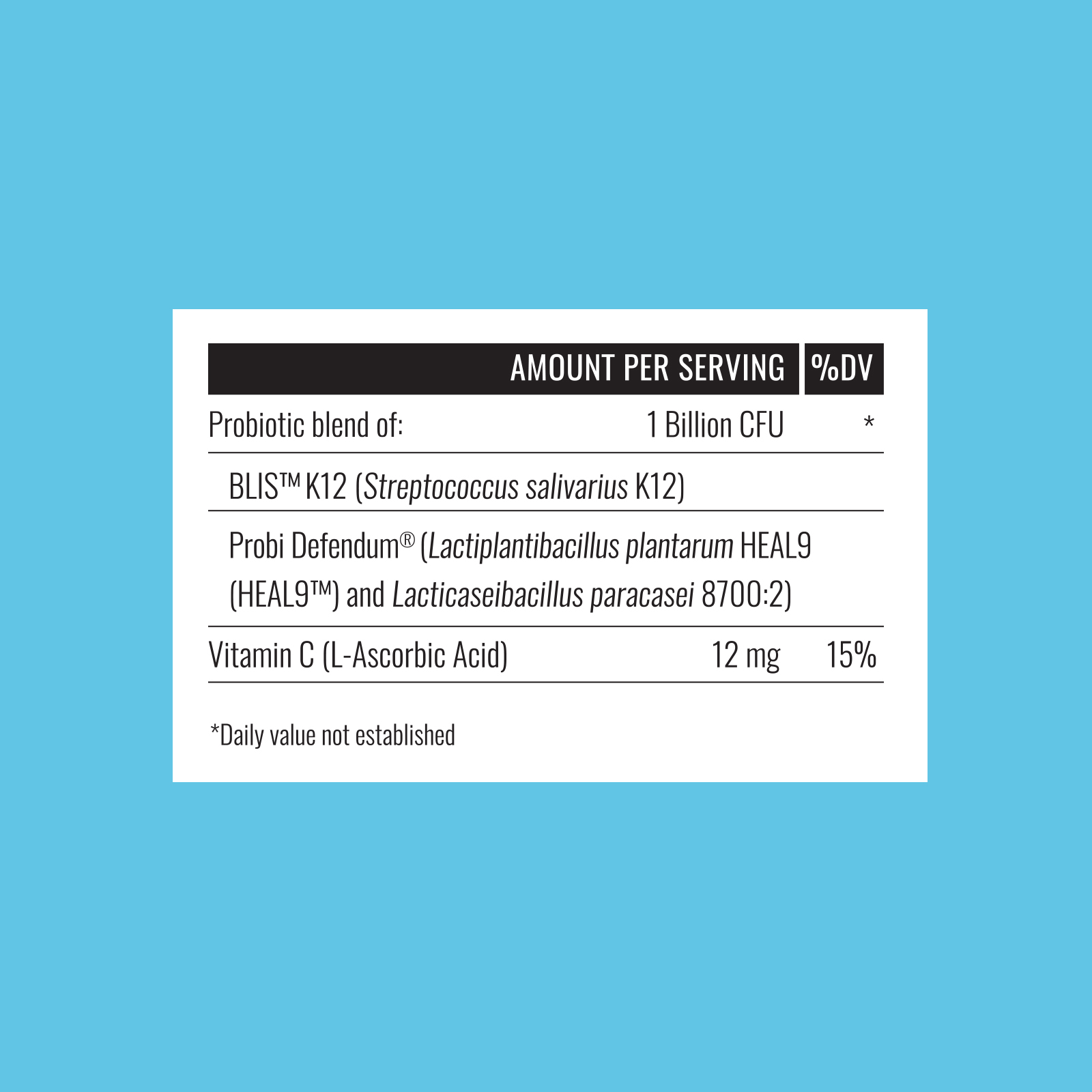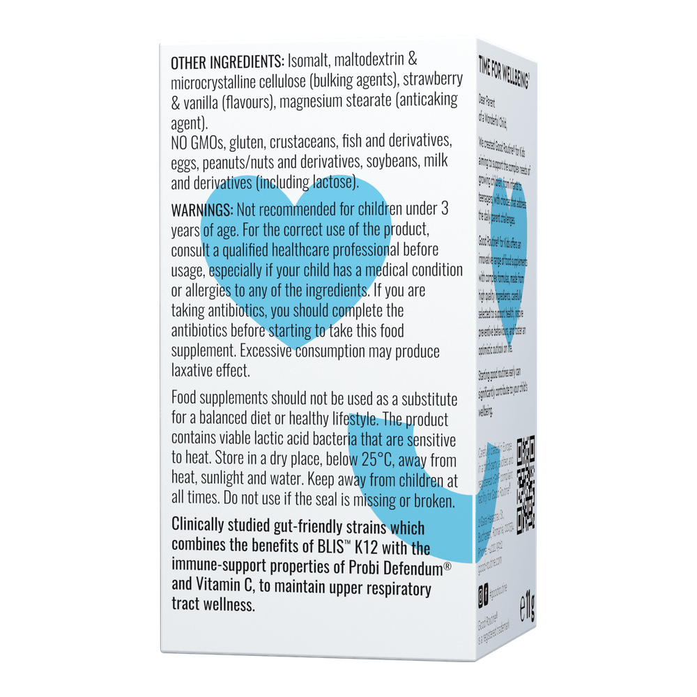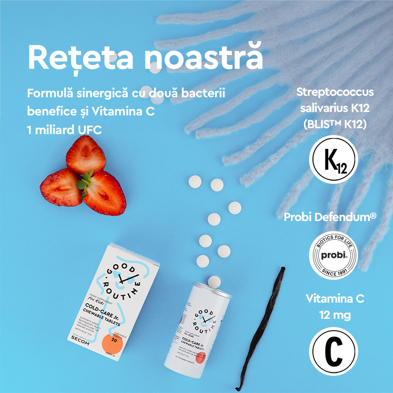 Formulă pe bază de bacterii benefice patentate și documentate științific BLIS™ K12 și Probi Defendum®, pentru colonizarea în mod natural a sistemului respirator superior și vitamina C, care contribuie la funcționarea normală a sistemului imunitar și la formarea normală a colagenului pentru susținerea sănătății dinților.