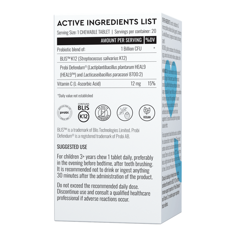 Ingrediente/1 tabletă: izomalt, celuloză microcristalină (agenți de încărcare); amestec de bacterii benefice patentate BLIS™ K12 (Streptococcus salivarius K12) și Probi Defendum® (Lactiplantibacillus plantarum HEAL9 (HEAL™) și Lacticaseibacillus paracasei 8700:2) în bază de maltodextrină și celuloză microcristalină (agenți de încărcare) 1 mld UFC*; aromă de căpșuni și vanilie; vitamina C (acid ascorbic) 12 mg (15% VNR**); stearat de magneziu (agent antiaglomerant).