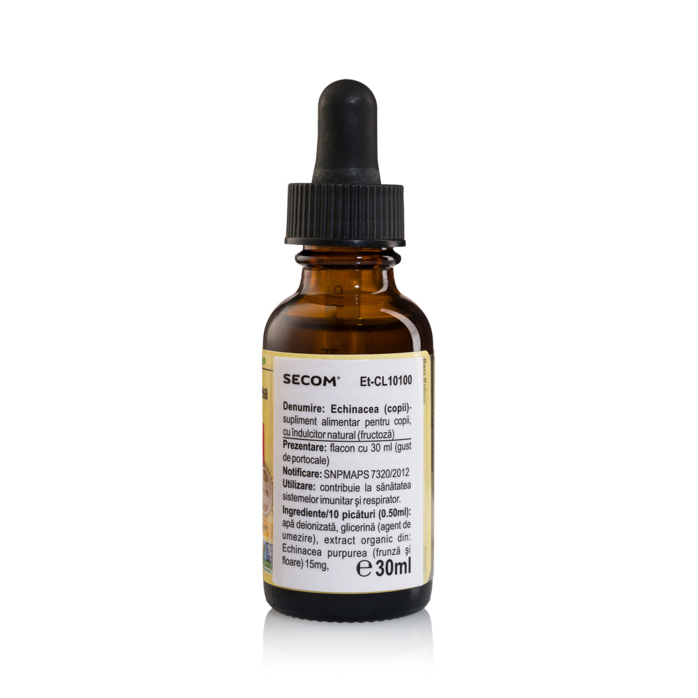 Ingrediente / 10 picături (0.50 ml): apă deionizată, glicerină (agent de umectare), extract organic din Echinacea purpurea (frunză și floare) 15 mg, Echinacea angustifolia (rădăcină) 15 mg, fructoză (îndulcitor), ulei natural de portocale (aromă).