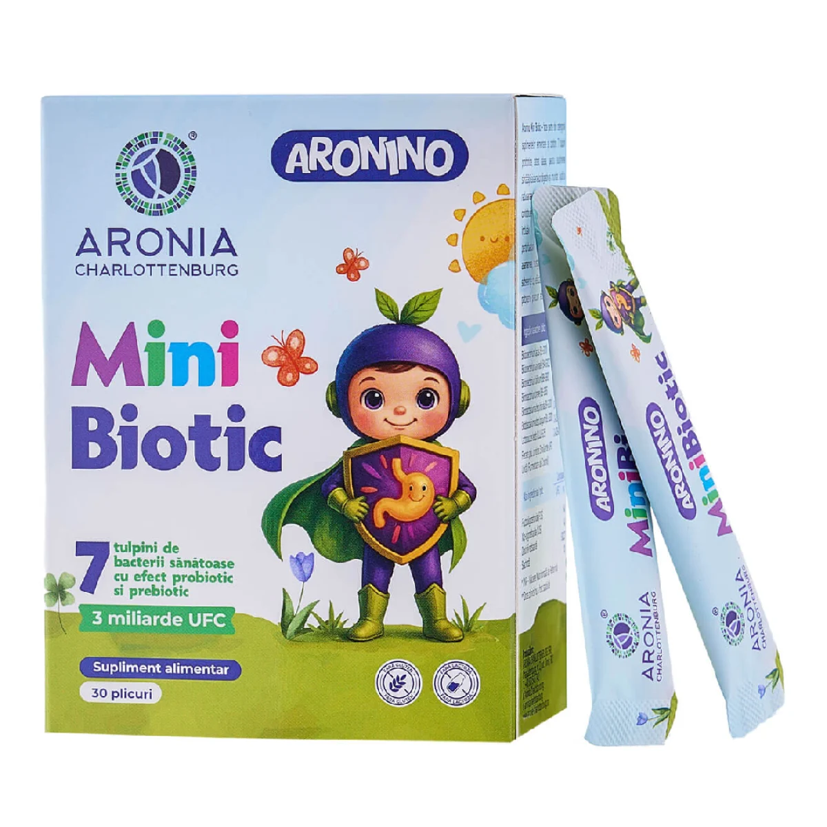 Mini Biotic Aronino este un supliment alimentar special formulat pentru copiii peste 3 ani, cu 7 tulpini de probiotice și 4 tipuri de prebiotice. Formula oferă 3 miliarde UFC per plic și este concepută pentru administrare ușoară, zilnică, timp de o lună.