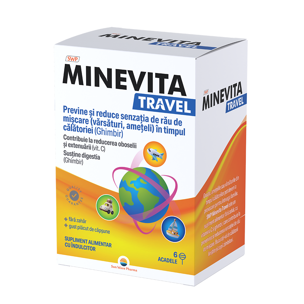Minevita Travel este un supliment alimentar sub formă de acadele, cu extract de ghimbir și vitamina C, conceput pentru a fi utilizat înainte și în timpul călătoriilor, ca parte a unui stil de viață activ.