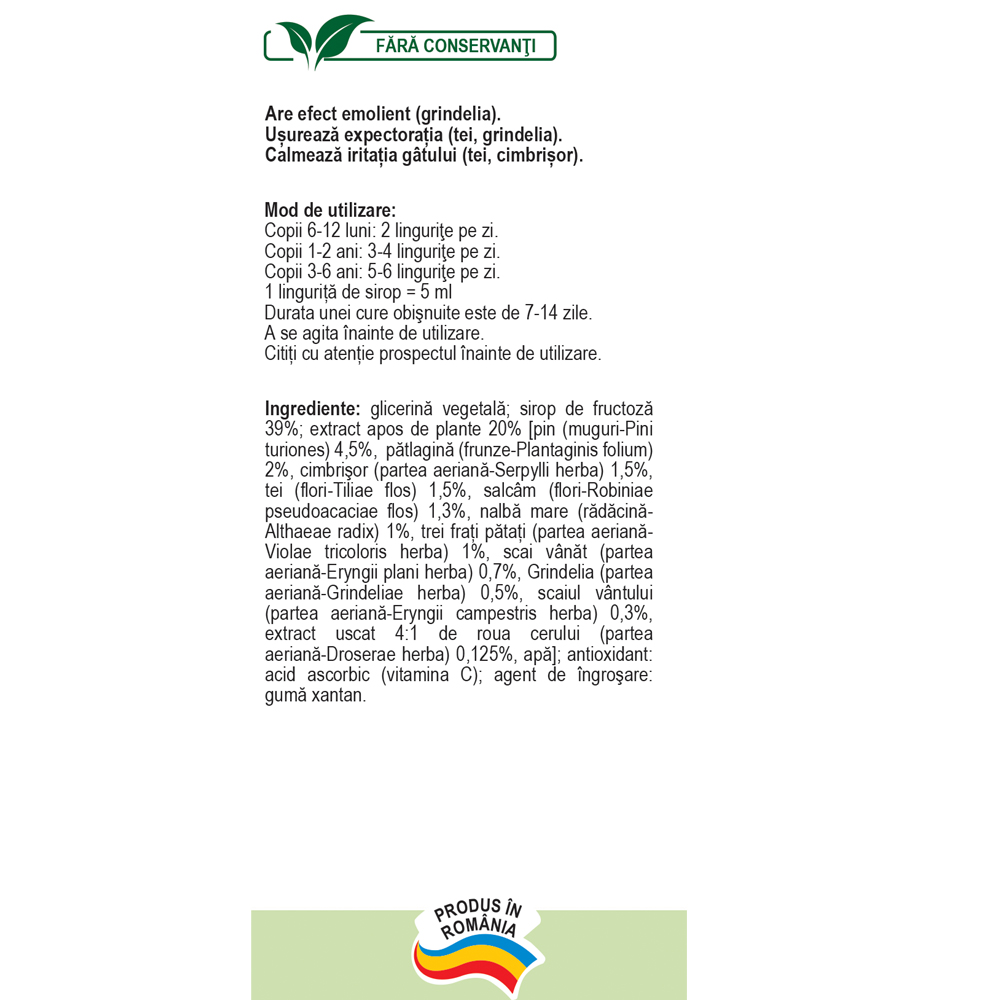 glicerină vegetală, sirop de fructoză 39%, extract apos de plante 20% [pin (muguri-Pini turiones) 4,5%, pătlăgină (frunze-Plantaginis folium) 2%, cimbrișor (partea aeriană-Serpylli herba) 1,5%, tei (flori-Tiliae flos) 1,5%, salcâm (flori-Robiniae pseudoacaciae flos) 1,3%, nalbă mare (rădăcină-Althaeae radix) 1%, trei frați pătați (partea aeriană-Violae tricoloris herba) 1%, scai vânăt (partea aeriană-Eryngii plani herba) 0,7%, Grindelia (partea aeriană-Grindeliae herba) 0,5%, scaiul vântului (partea aeriană-Eryngii campestris herba) 0,3%, extract uscat 4:1 de roua cerului (partea aeriană-Droserae herba) 0,125%, apă], antioxidant: acid ascorbic (vitamina C), agent de îngroșare: gumă xantan.