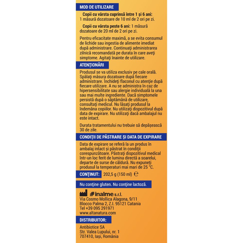 Produsul se va utiliza exclusiv pe cale orală. Spălați măsura dozatoare după fiecare administrare. Închideți flaconul cu atenție după fiecare utilizare. A nu se administra în caz de hipersensibilitate sau alergie individuală la una sau mai multe ingrediente. Dacă simptomele persistă după o săptămână de utilizare, consultați medicul. Nu lăsați produsul la îndemâna copiilor. Nu utilizați dispozitivul după data de expirare. Nu utilizați dacă ambalajul nu este intact.