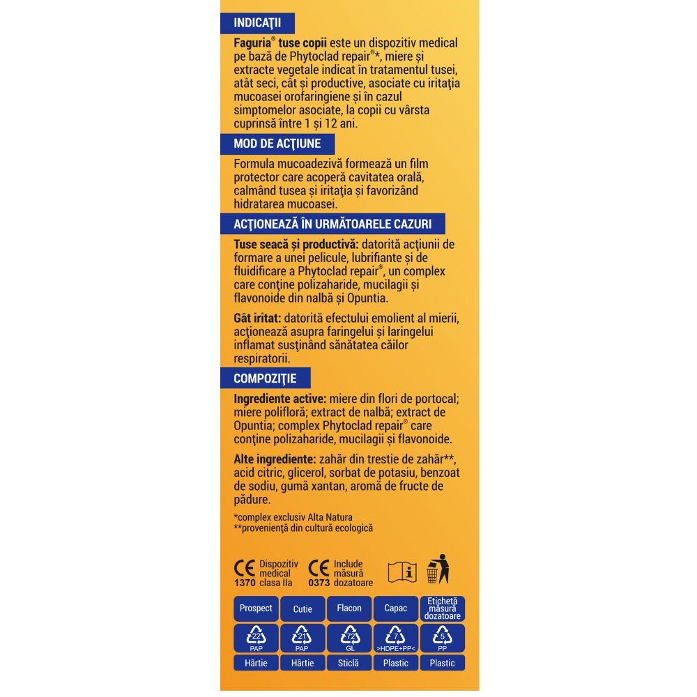 Faguria® tuse copii este un dispozitiv medical pe bază de Phytoclad repair®*, miere și extracte vegetale indicat în tratamentul tusei, atât seci, cât și productive, asociate cu iritația mucoasei orofaringiene și în cazul simptomelor asociate, la copii cu vârsta cuprinsă între 1 și 12 ani.