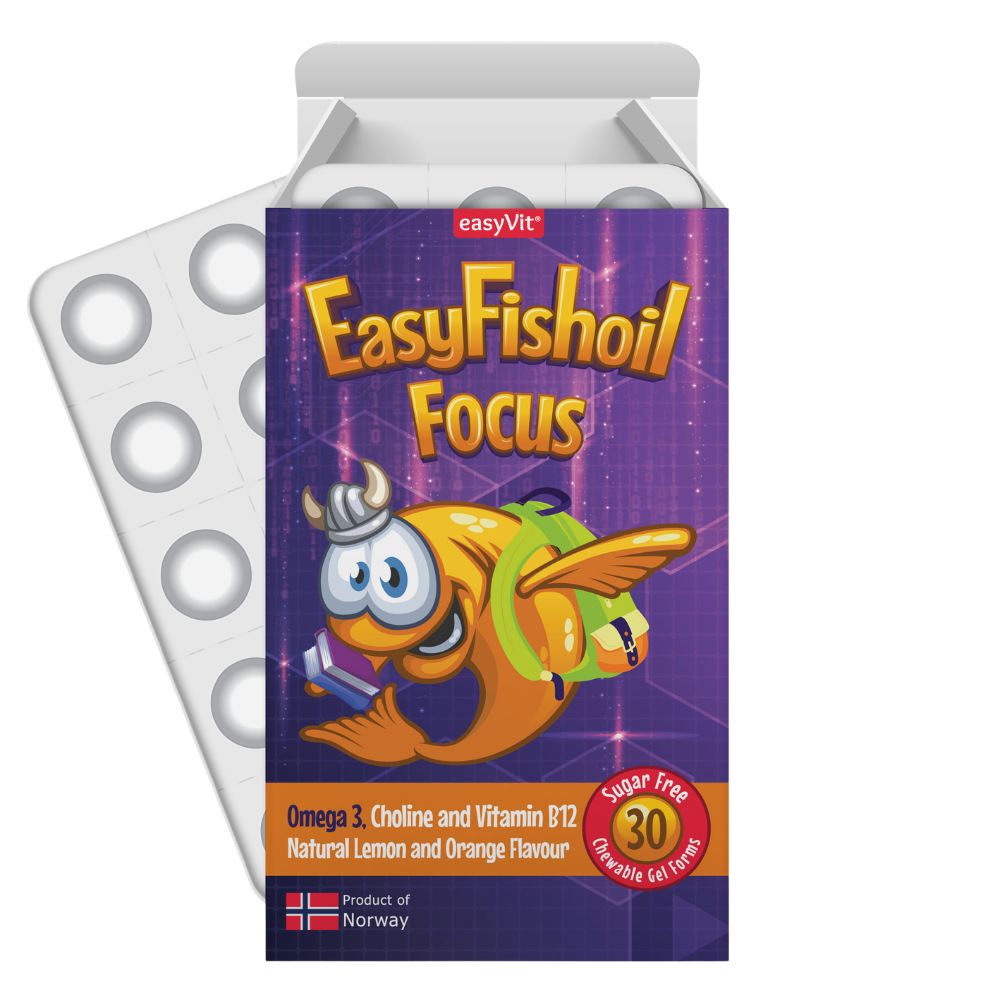 Easy Fishoil Focus supliment alimentar cu Omega 3, colină, vitamina B6, vitamina B12 și acid folic, cu îndulcitor.