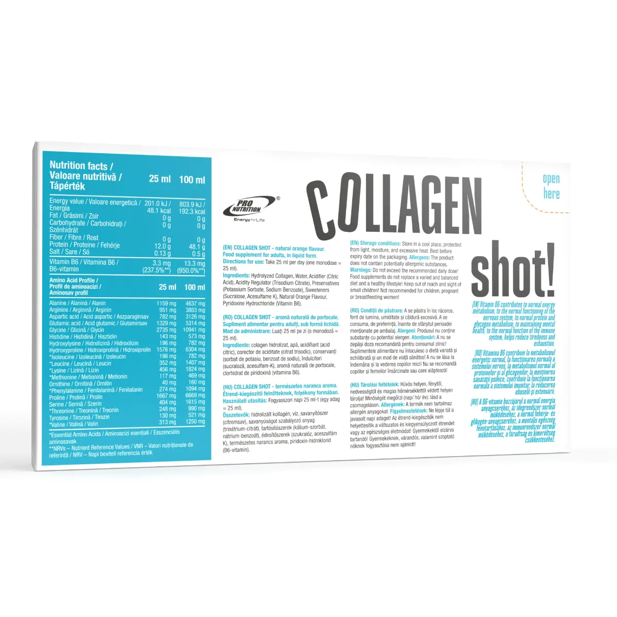 colagen hidrolizat, apă, acidifiant (acid citric), corector de aciditate (citrat trisodic), conservanti (sorbat de potasiu, benzoat de sodiu), indulcitori (sucraloză, acesulfam-K), aromă naturală de portocale, clorhidrat de piridoxină (vitamina B6).