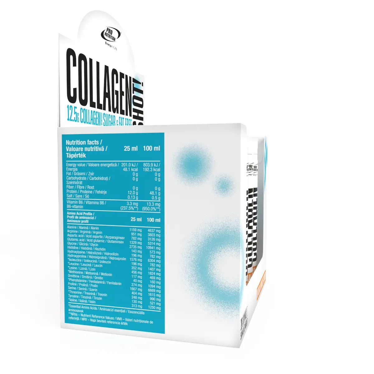 colagen hidrolizat, apă, acidifiant (acid citric), corector de aciditate (citrat trisodic), conservanti (sorbat de potasiu, benzoat de sodiu), indulcitori (sucraloză, acesulfam-K), aromă naturală de portocale, clorhidrat de piridoxină (vitamina B6).