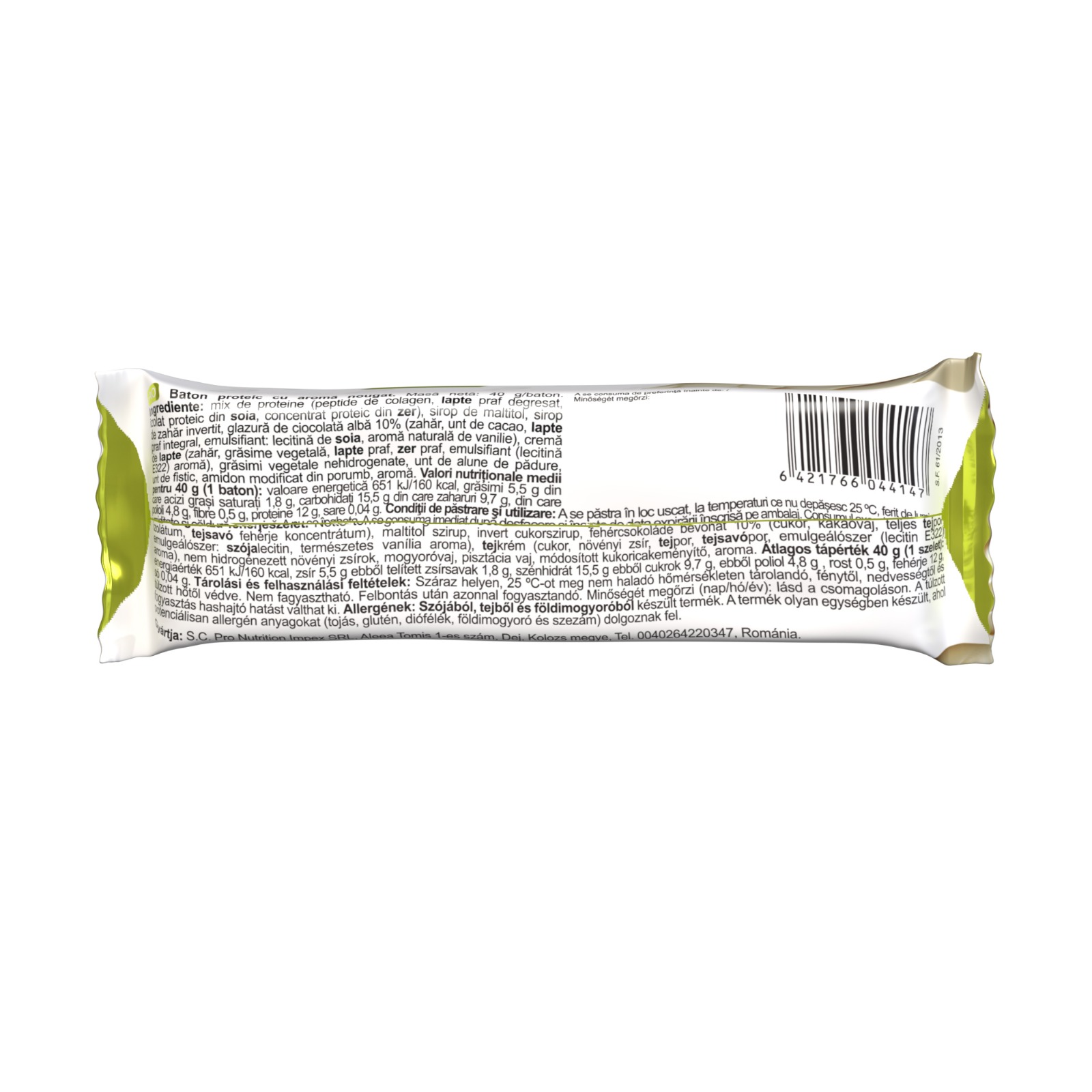 Mix de proteine (peptide de colagen, lapte praf degresat, izolat proteic din soia, concentrat proteic din zer), sirop de maltitol, sirop de zahar invertit, glazura de ciocolata alba 10% (zahar, unt de cacao, lapte praf integral, emulsifiant: lecitina de soia, aroma naturala de vanilie), crema de lapte (zahar, grasime vegetala, lapte praf, zer praf, emulsifiant (lecitina E322), aroma), grasimi vegetale nehidrogenate, unt de alune de padure, unt de fistic, amidon modificat din porumb, aroma.