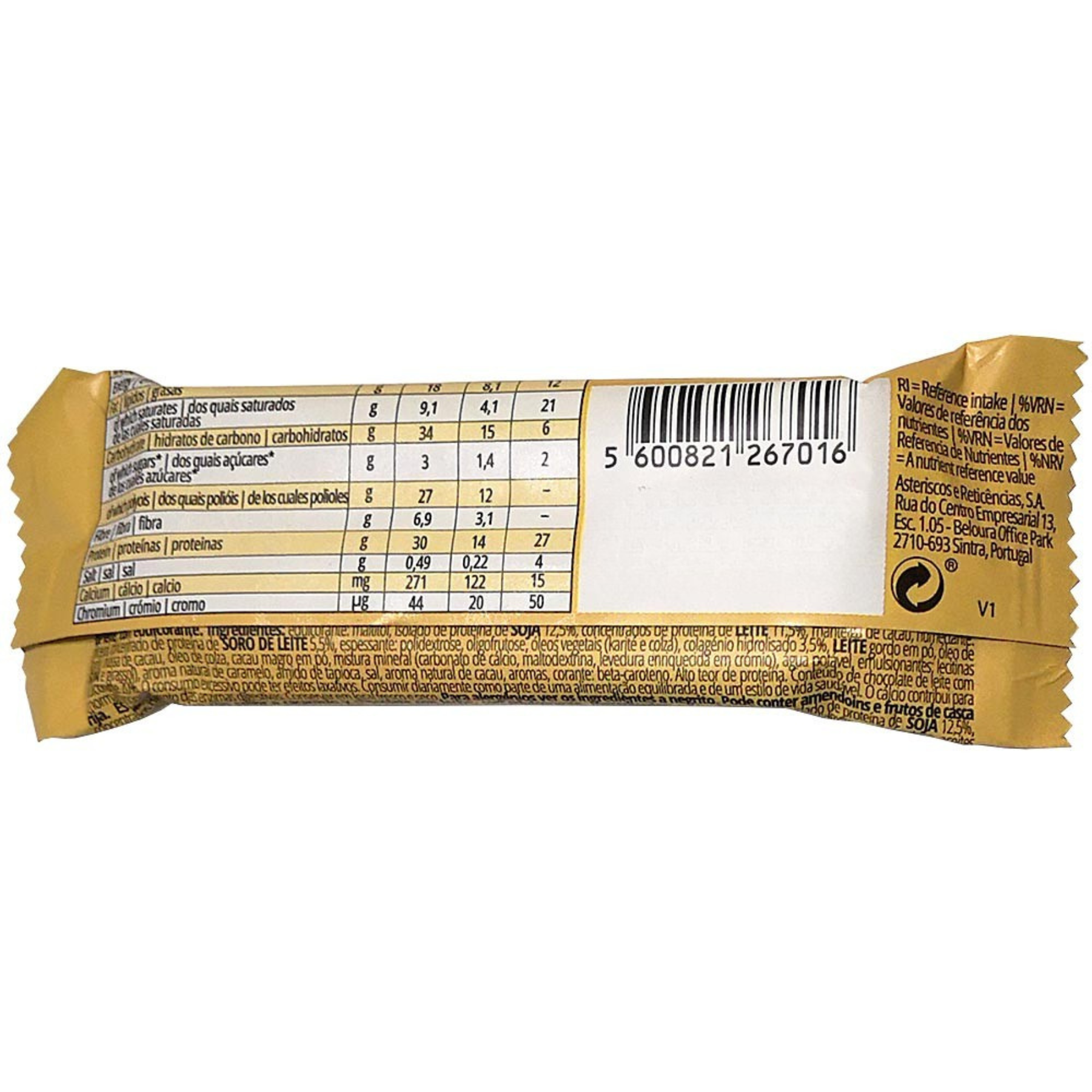 Indulcitor: maltitol, izolat proteic din SOIA 12.5%, concentrat proteic din LAPTE 11.5 %, unt de cacao, umectant: glicerol, concentrat proteic din GRAU 5.5%, agent de ingrosare: polidextroza, oligofructoza, uleiuri vegetale (shea si rapita), colagen hydrolizat 3.5%, LAPTE integral pudra, ulei de shea, masa de cacao, ulei de rapita, pudra de cacao cu continut redus de grasimi, amestec de minerale (carbonat de calciu, maltodextrina, drojdie imbogatita cu crom), apa, emulgator: lecitina (SOIA si floarea soarelui), aroma naturala de caramel, amidon de tapioca, sare, aroma naturala de cacao, arome, colorant: beta-caroten. Poate contine urme de ARAHIDE, FRUCTE CU COAJA LEMNOASA.