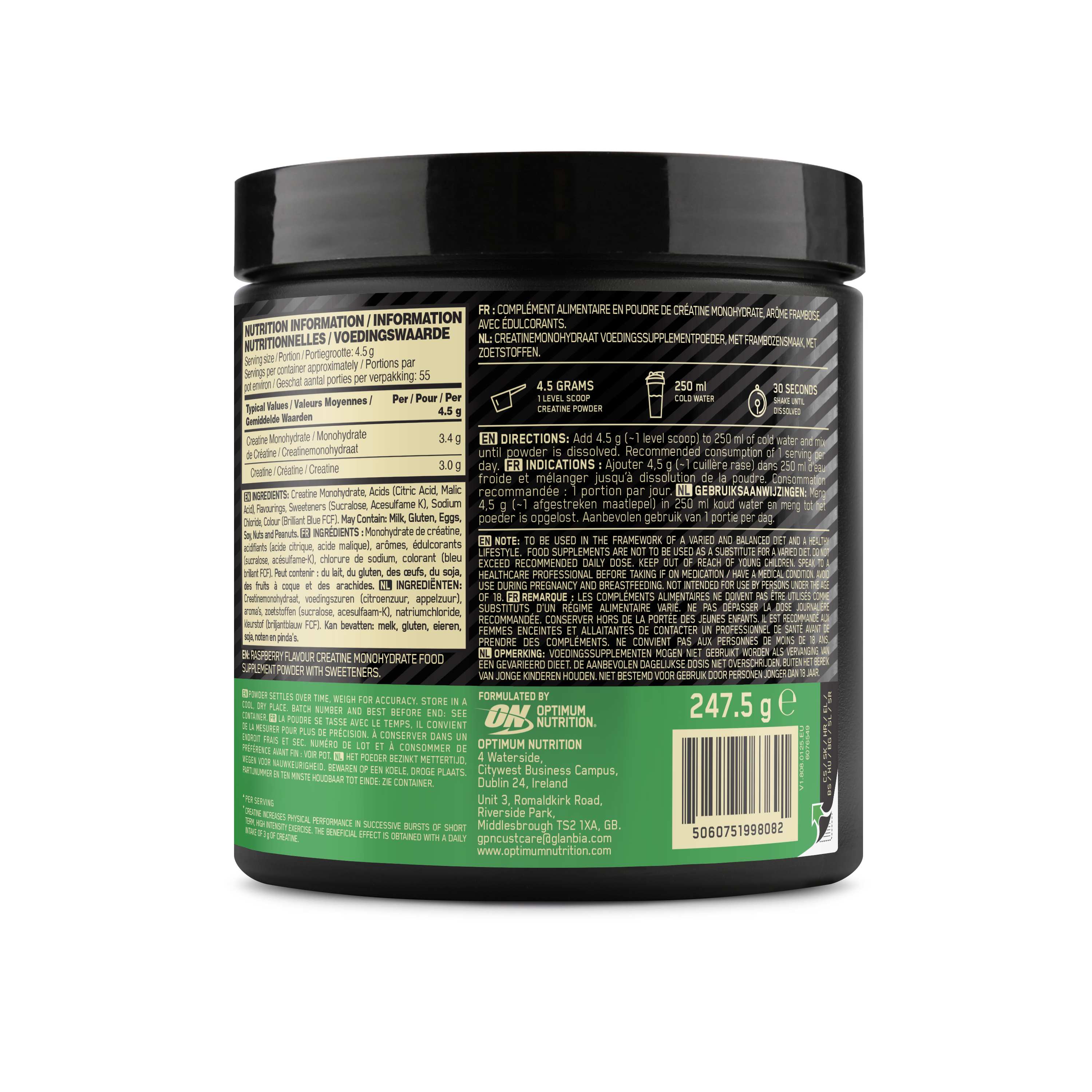 Creatină monohidrată micronizată cu aromă de zmeură, Optimum Nutrition ON Creatine Powder oferă 3,4 g per porție și se dizolvă rapid în apă, fiind o soluție practică pentru susținerea performanței în exerciții fizice de intensitate ridicată.