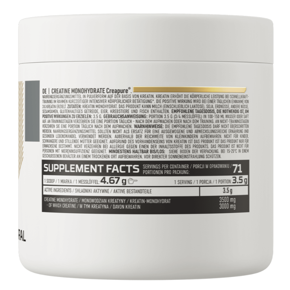 Produsul conține creatină monohidrat Creapure® – o formă pură, obținută prin combinarea unei molecule de creatină cu o moleculă de apă. Datorită structurii sale simple și solubilității ridicate, creatina monohidrat se remarcă printr-o asimilare excelentă și este una dintre cele mai utilizate forme de creatină în rândul sportivilor.