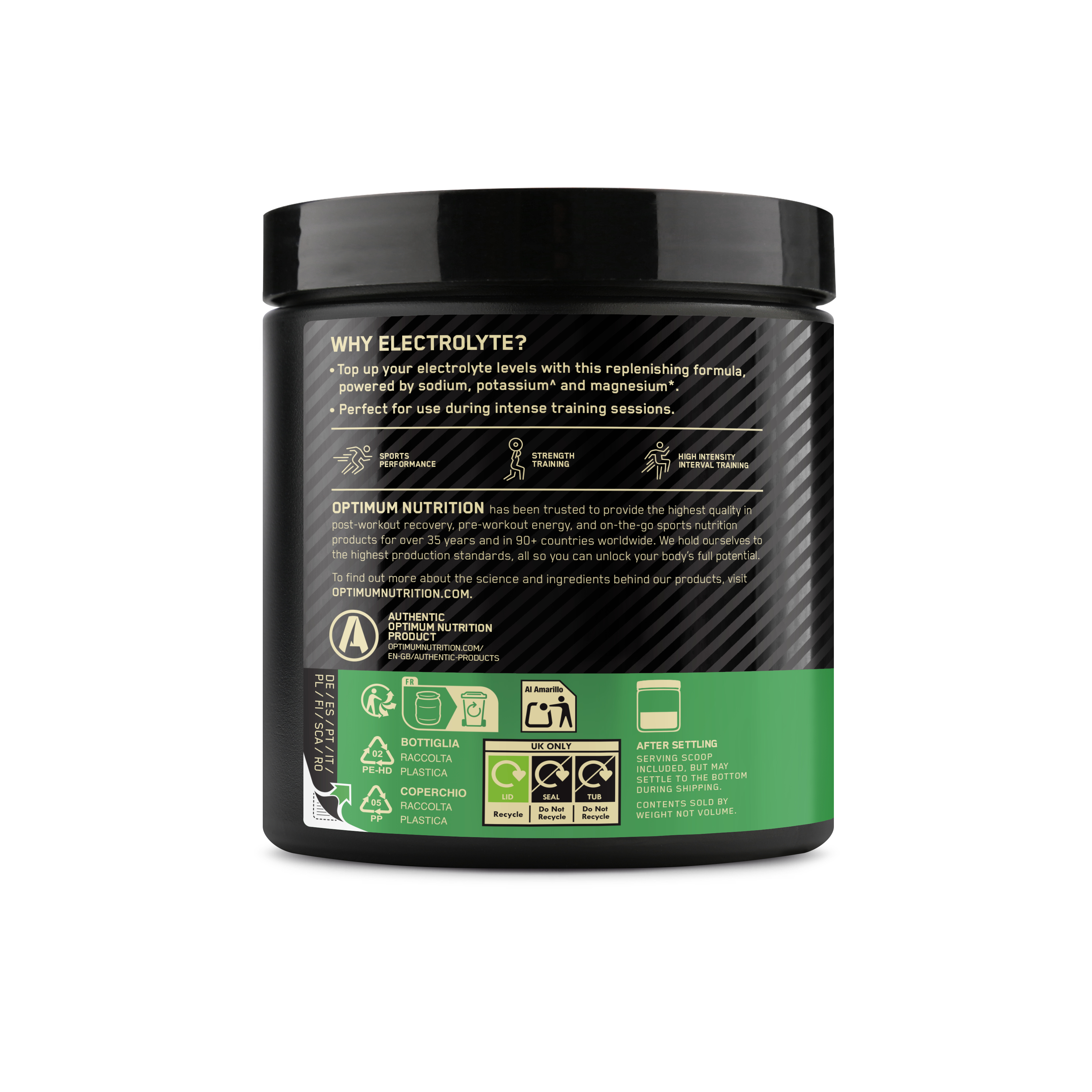 Electroliți sub formă de pulbere, Optimum Nutrition ON Electrolytes, cu sodiu, potasiu, magneziu și calciu, oferă o soluție practică pentru menținerea echilibrului electrolitic și hidratare în timpul antrenamentelor intense.