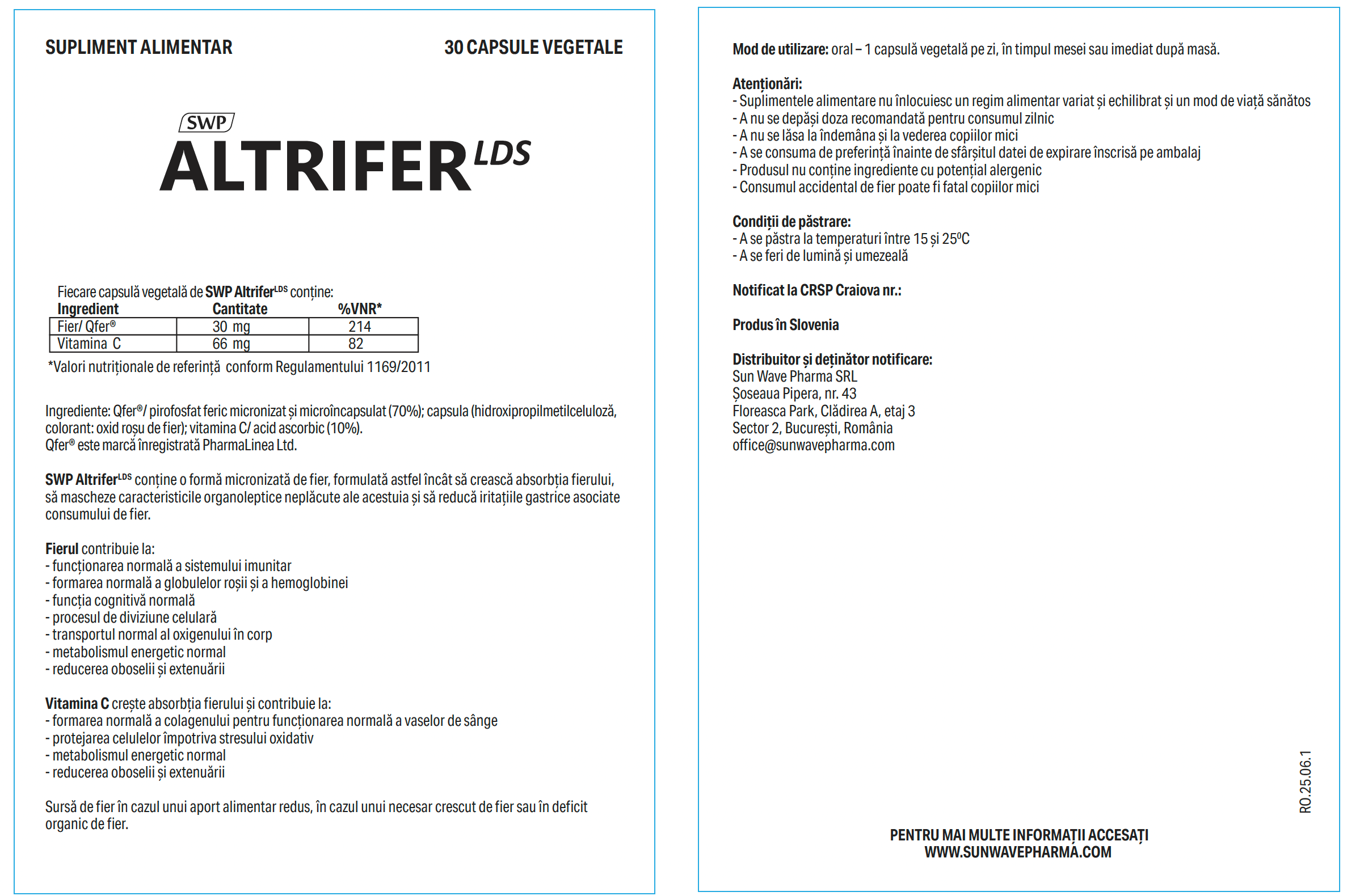 Altrifer LDS conține o formă micronizata de fier, dispersabilă în apă, formulată astfel încât să crească absorbția fierului, să mascheze caracteristicile organoleptice neplăcute ale acestuia și să reducă iritațiile gastrice asociate consumului de fier. Vitamina C din compoziție crește absorbția fierului în organism și reduce oboseala și extenuarea.