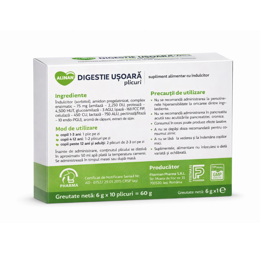 Alinan® Digestie Ușoară este un supliment alimentar sub formă de plicuri, special conceput pentru susținerea digestiei la copii și adulți. Formula sa conține un complex de enzime digestive care contribuie la descompunerea eficientă a proteinelor, carbohidraților, grăsimilor și lactozei, susținând procesul digestiv și confortul abdominal.