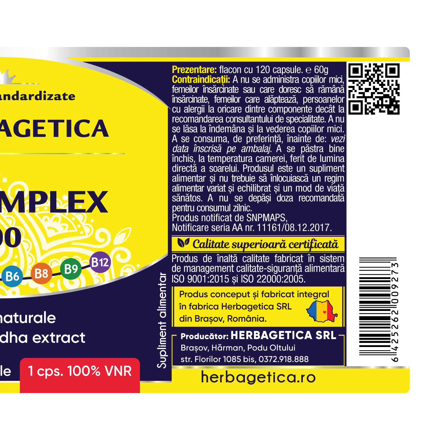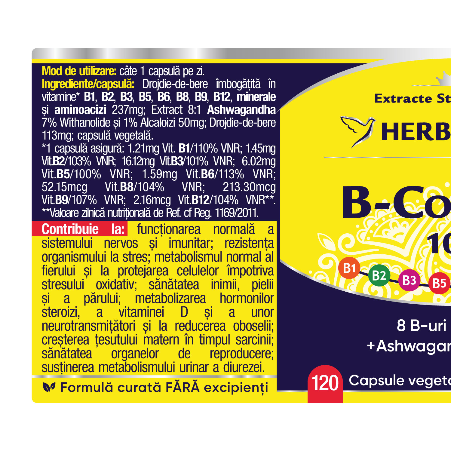 *Analiză nutrițională (1 capsulă asigură): 1.21mg Vit. B1 (110% VNR); 1.45mg Vit. B2 (103% VNR); 16.12mg Vit. B3 (101% VNR); 6.02mg Vit. B5 (100% VNR); 1.59mg Vit. B6 (113% VNR); 52.15mcg Vit. B8 (104% VNR); 213.30mcg Vit. B9 (107% VNR); 2.16mcg Vit. B12 (104% VNR). **VNR = Valoare zilnică nutrițională de Ref. cf Reg. 1169/2011.