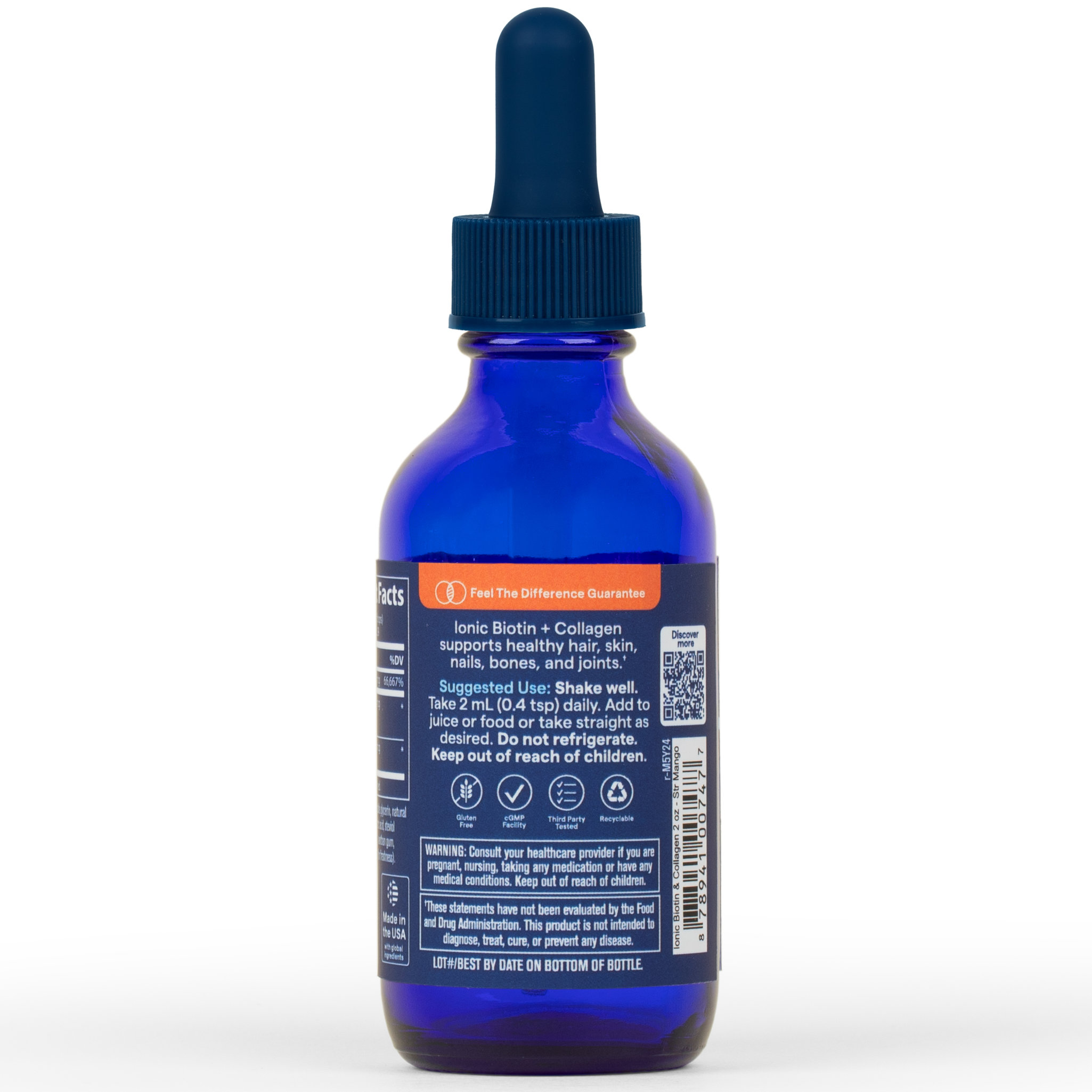• Conține biotină – 5.000 mcg per porție (0,5 ml / 10 picături), reprezentând 100% VNR.