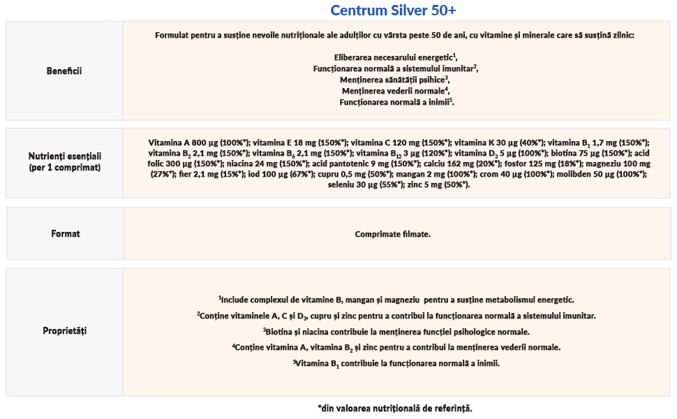 Centrum silver 50+ este un supliment alimentar pentru utilizare zilnică, formulat special pentru femei și bărbați de peste 50 de ani. Conține 24 de ingrediente esențiale, inclusiv cele 13 vitamine vitale, pentru a susține nivelul optim de energie, imunitatea, funcția cardiacă, vederea și sănătatea oaselor. Centrum silver 50+ este susținut de peste 40 de ani de cercetare nutrițională și este potrivit ca parte a unui stil de viață activ și echilibrat.