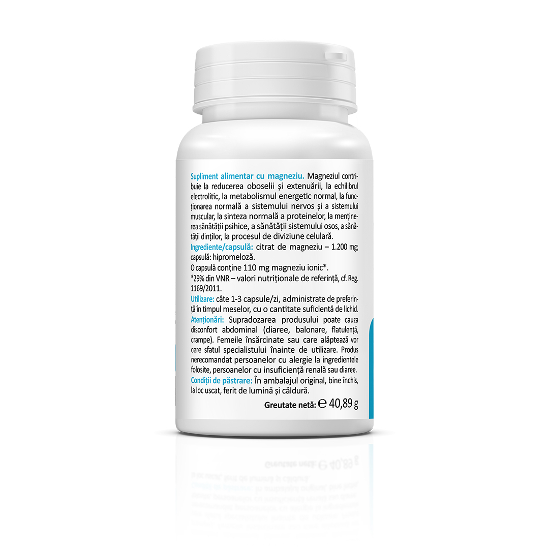 Supliment alimentar cu citrat de magneziu, formulat pentru susținerea metabolismului energetic normal, funcționarea normală a sistemului muscular și nervos și menținerea echilibrului electrolitic.