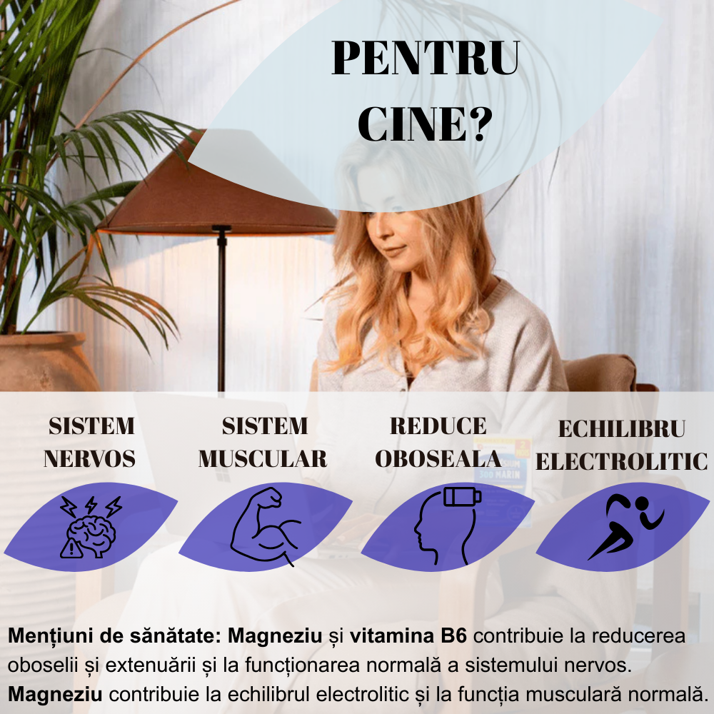 Formula sa îmbină magneziul prezent în mod natural în apa de mare cu vitamina B6, contribuind la reducerea oboselii și la funcționarea normală a sistemului nervos1.