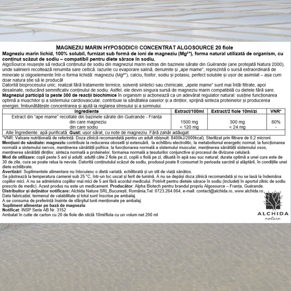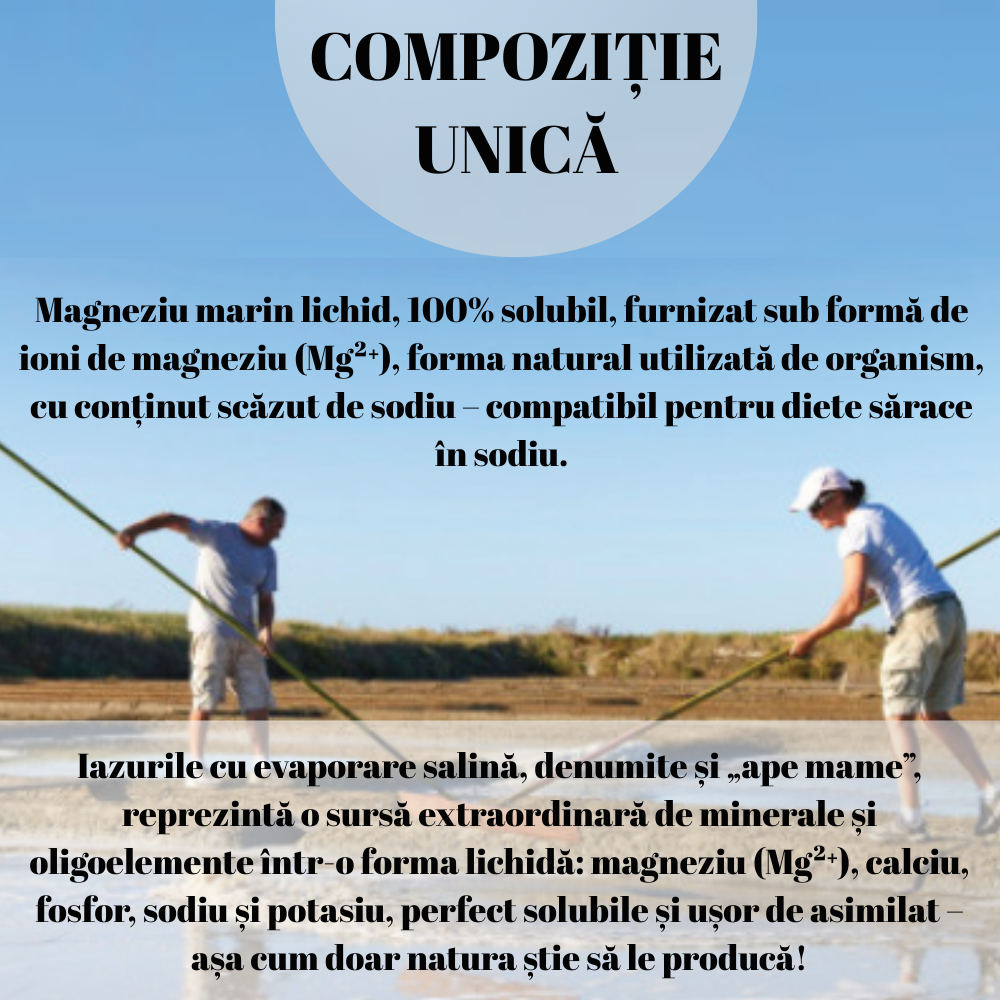 Magneziu marin lichid, 100% solubil, furnizat sub formă de ioni de magneziu (Mg²⁺), forma natural utilizată de organism, cu conținut scăzut de sodiu – compatibil pentru diete sărace în sodiu.