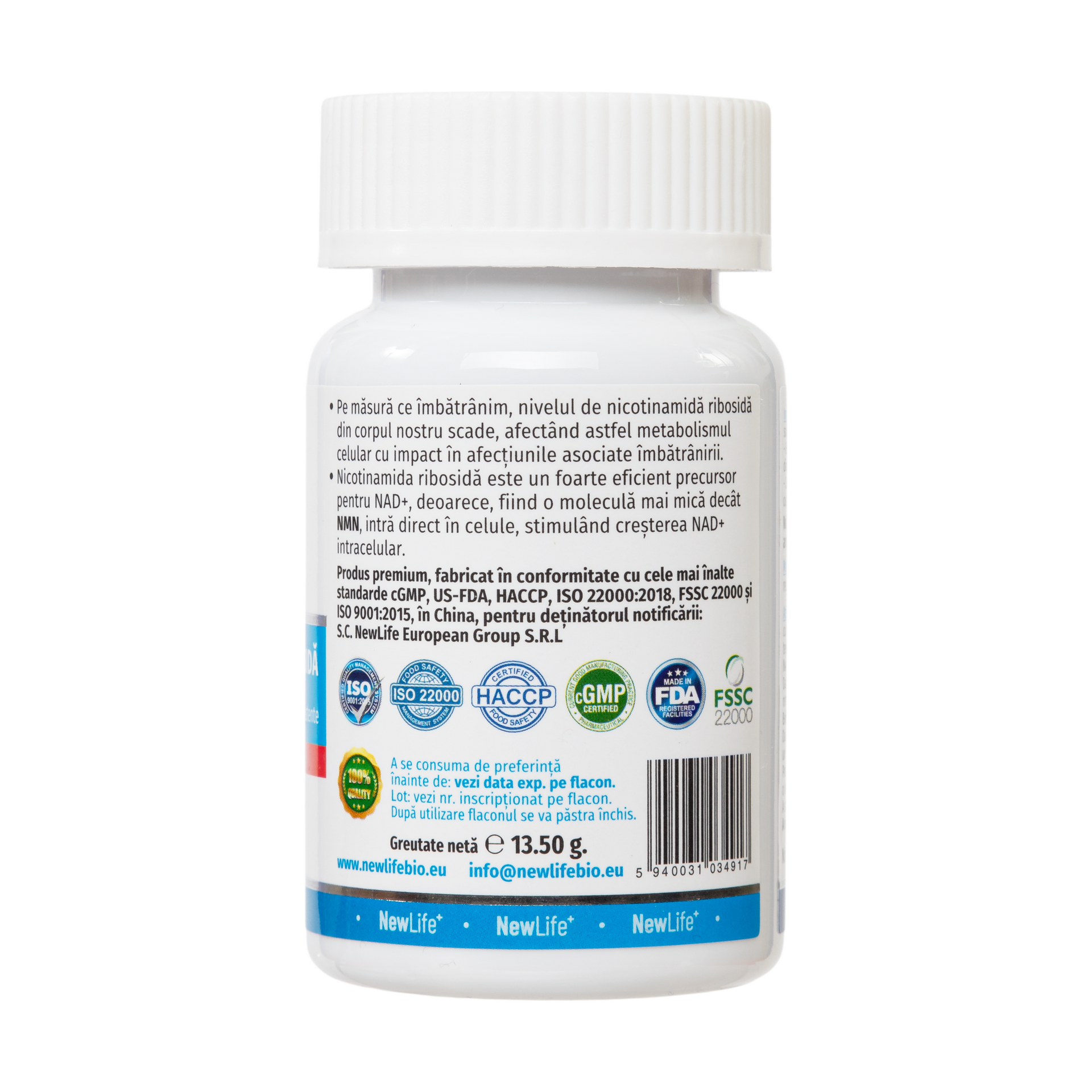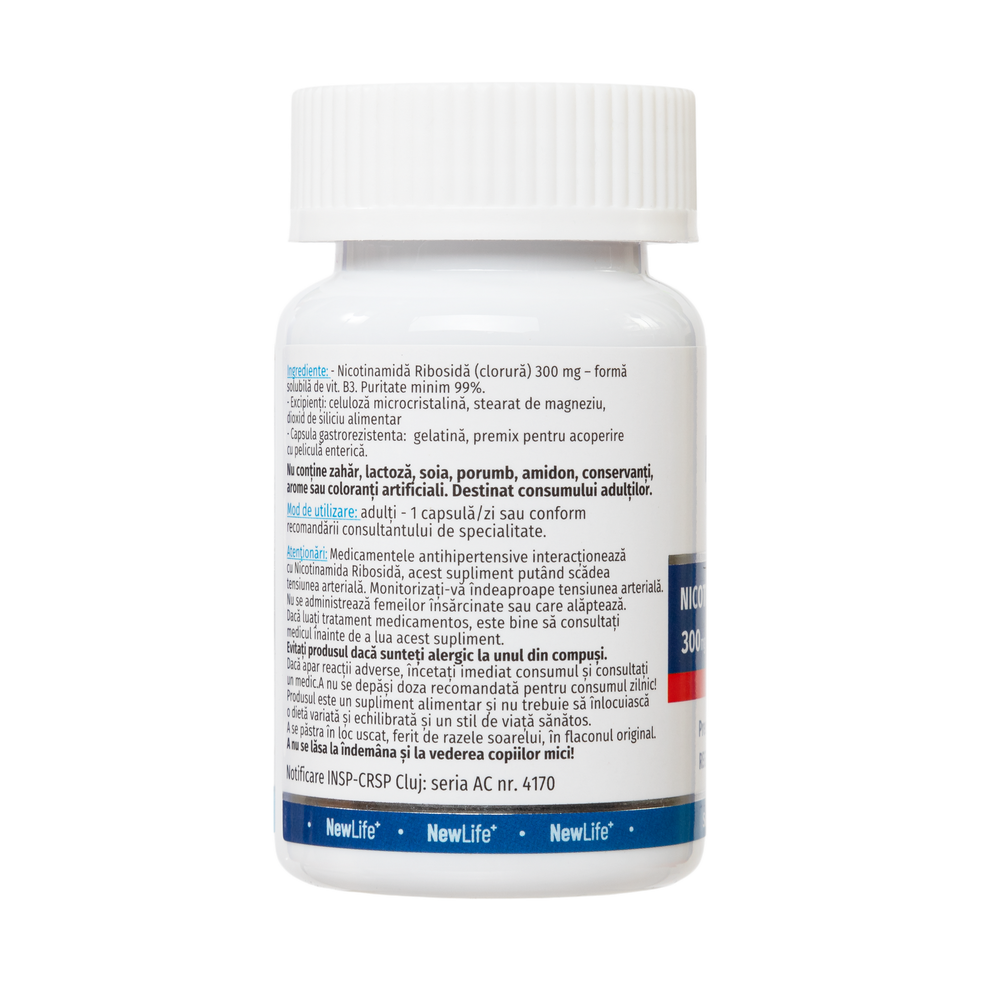 • Nicotinamidă Ribosidă (clorură) 300 mg – formă solubilă de vit. B3. Puritate minim 99%.