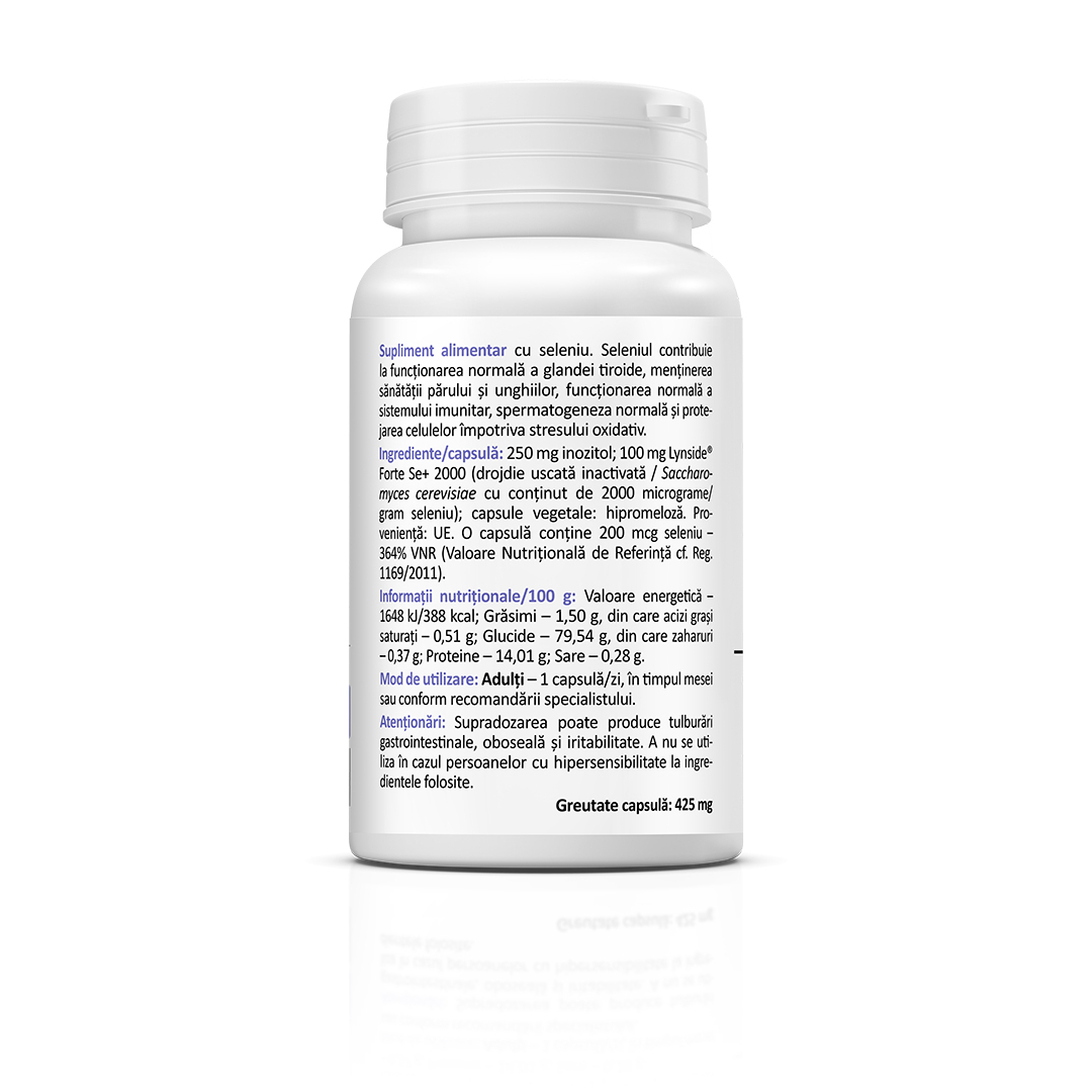 Supliment alimentar cu seleniu și inozitol, destinat completării aportului zilnic de micronutrienți în cadrul unei alimentații echilibrate.
