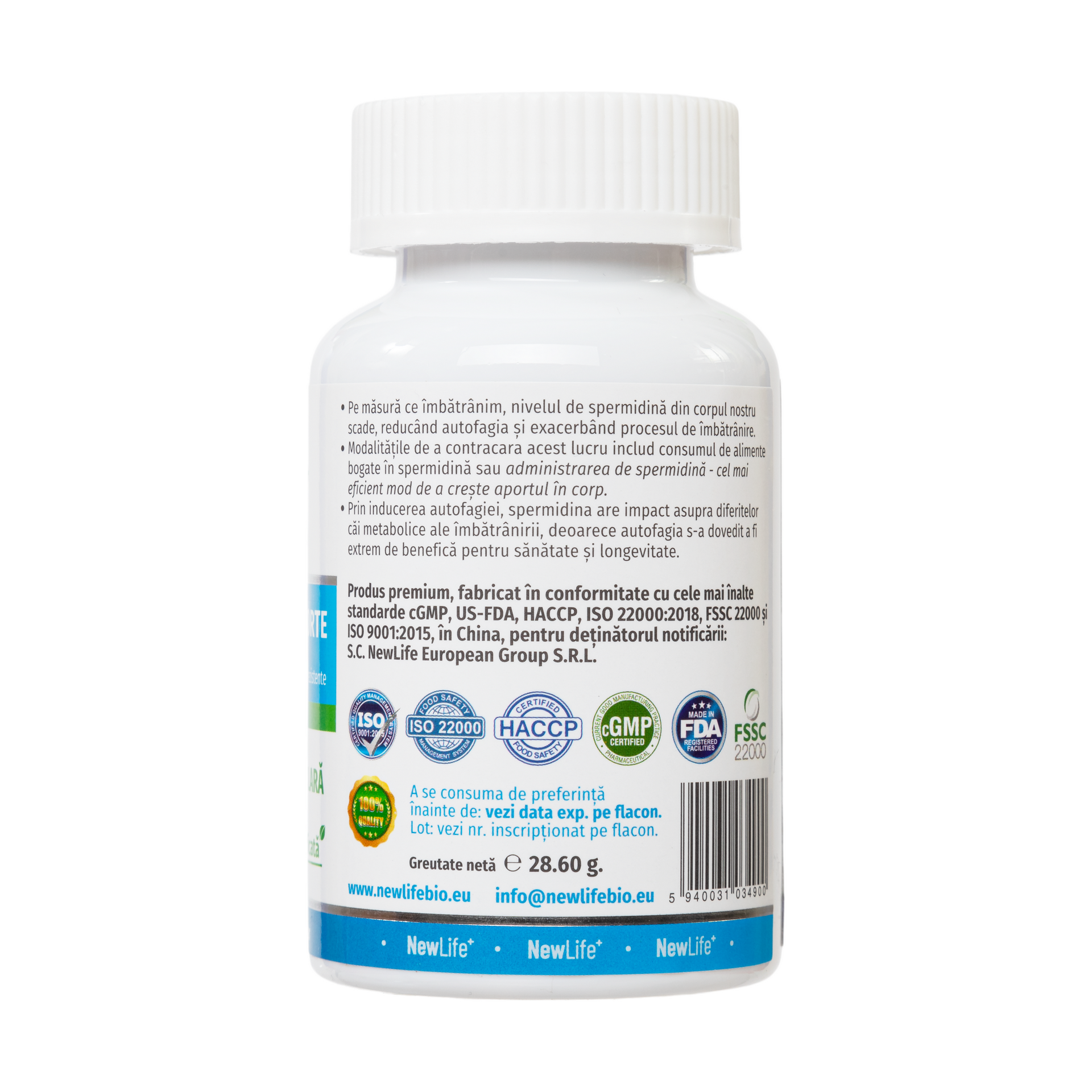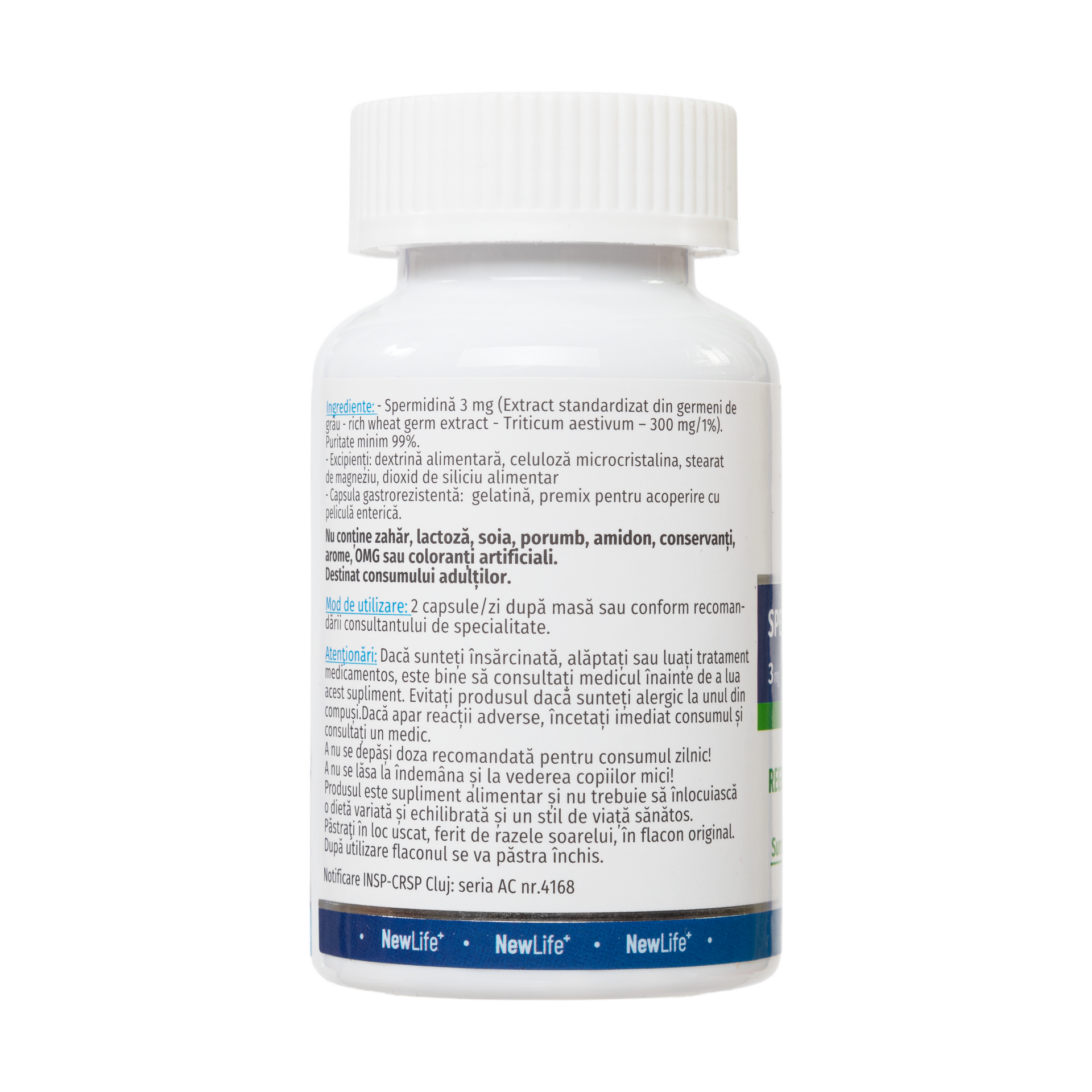 • Spermidină 3 mg (Extract standardizat din germeni de grâu - rich wheat germ extract - Triticum aestivum - 300 mg /1%).