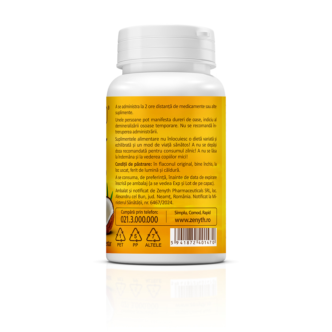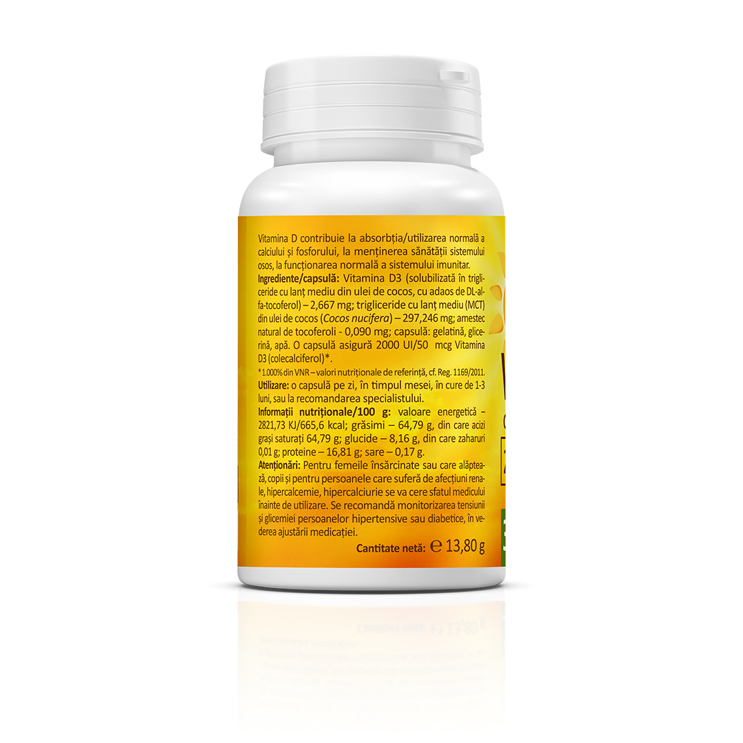Supliment alimentar cu vitamina D3, sub formă de capsule, solubilizată în trigliceride din ulei de cocos, pentru aport zilnic.