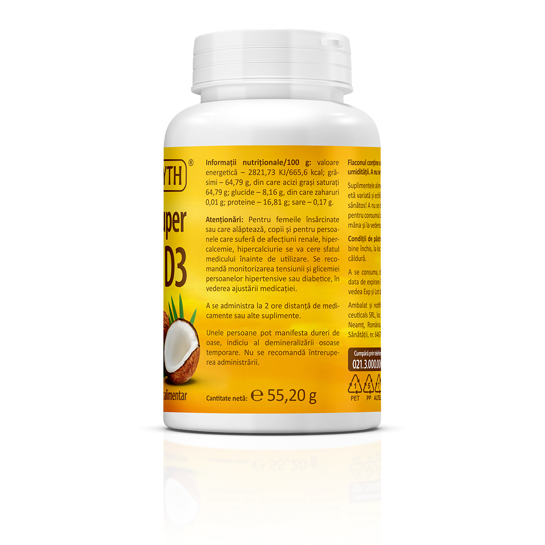Supliment alimentar cu vitamina D3, sub formă de capsule, solubilizată în trigliceride din ulei de cocos.