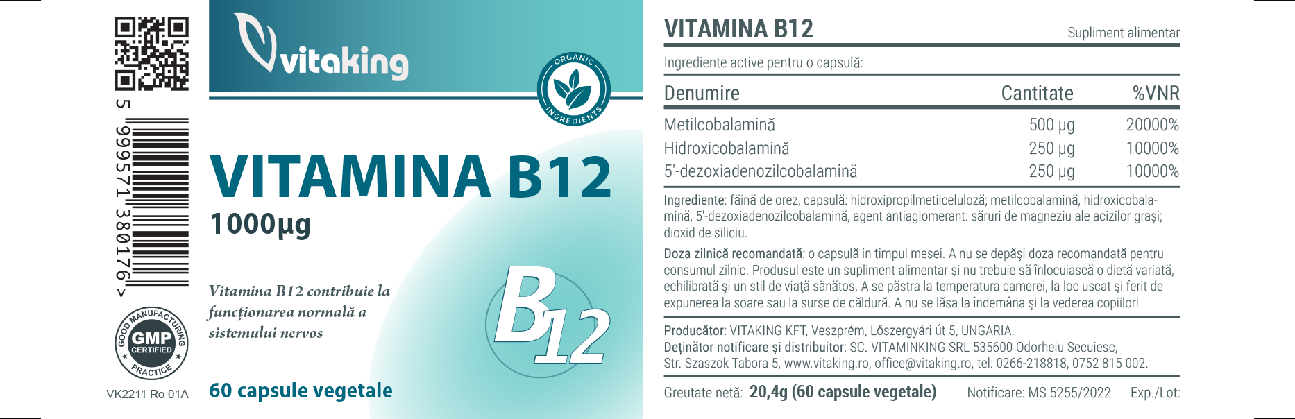Vitamina B12 - 1000 mcg conține 3 forme naturale de vitamina B12: metilcobalamină, hidroxocobalamină și 5′-dezoxiadenozilcobalamină. Este formulată cu ingrediente de origine naturală și prezentată sub formă de capsule vegetale, fiind potrivită și pentru vegetarieni.