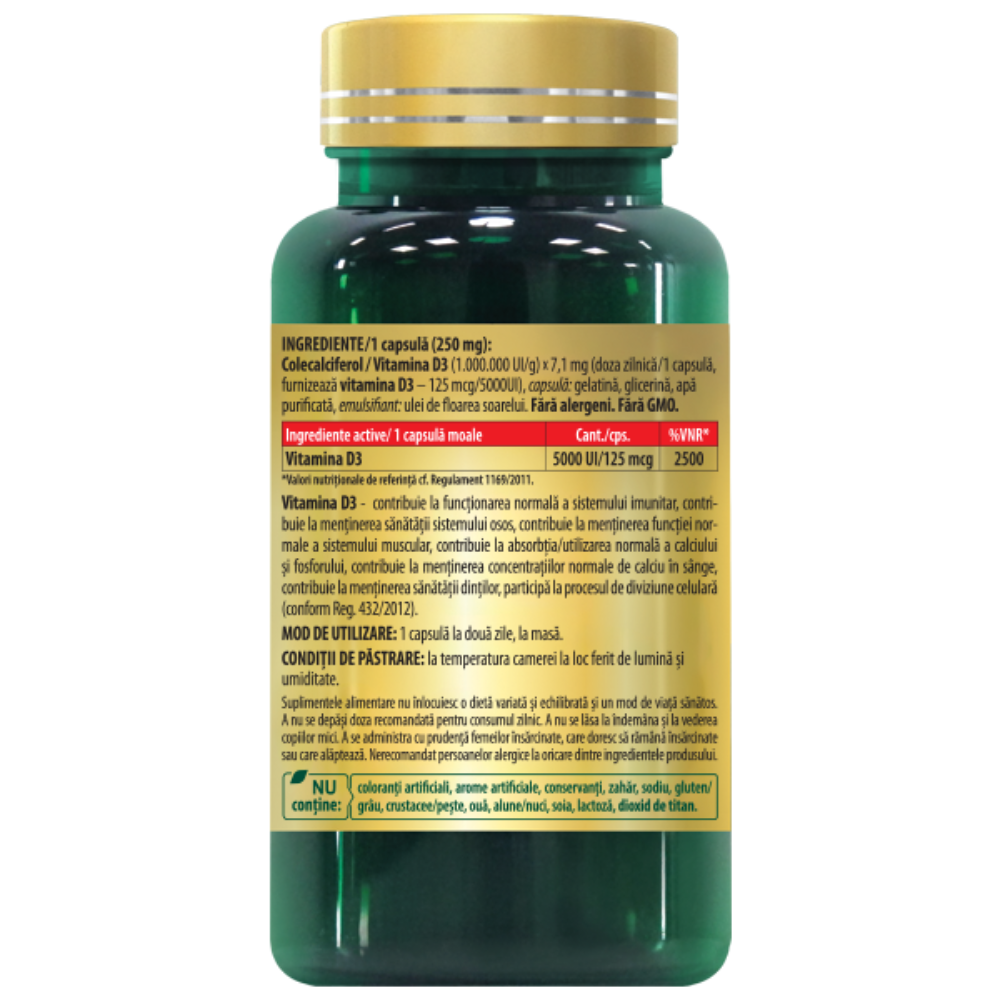 Conține vitamina D3 naturală (colecalciferol) cu 5000 UI per capsulă.