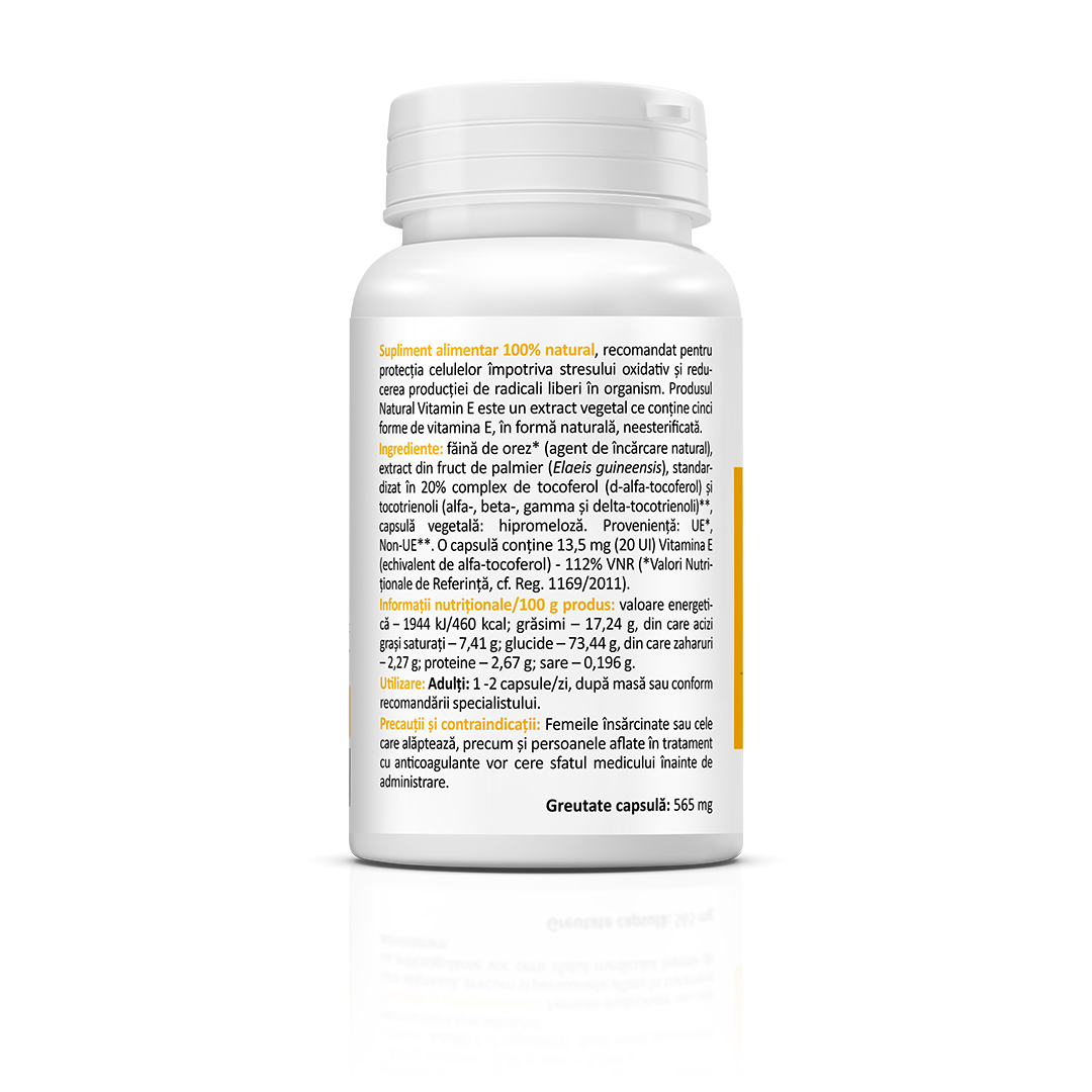 Supliment alimentar cu vitamina E naturala, sub forma de complex de tocoferoli si tocotrienoli, destinat completarii aportului nutritional zilnic.